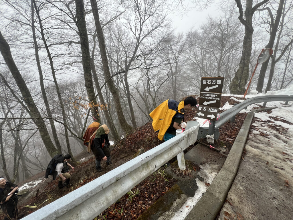2日目は1日目よりも雨が降っており傘をさしながら公道をひたすら歩きました。所々で地面が凍っていてとても滑りました。凍っているところといないところがあり、チェーンスパイクを履いたり脱いだりして大変でした。3時間ぐらい同じ景色を見て歩くのは疲れました。やっとの思いで温泉に着きました。温泉に入って2日分の疲れが取れました。お風呂上りのコーヒー牛乳もすごく美味しかったです。どしゃぶりの雨の中歩くのは初めてだったので大変でしたが、これもこれで楽しかったとも思いました。