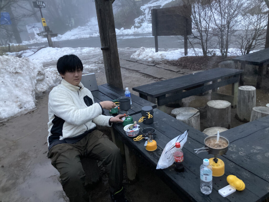 部員4人でスタートするはずだったのですが、塩山駅に着いたら1人体調不良で帰ってしまいました。その部員の意志を心に刻み、3人で大菩薩へとむかいました。少し雨が降っていて地面もぬかるんでいて、歩きづらかったです。しかし、段々と雪が広がって、これで歩きやすくなると思いましたが、次は凍っていて滑りやすくなっていました。そんな中頑張って歩いて、昼過ぎにはその日泊まる予定の山小屋に到着し、昼ごはんを食べました。