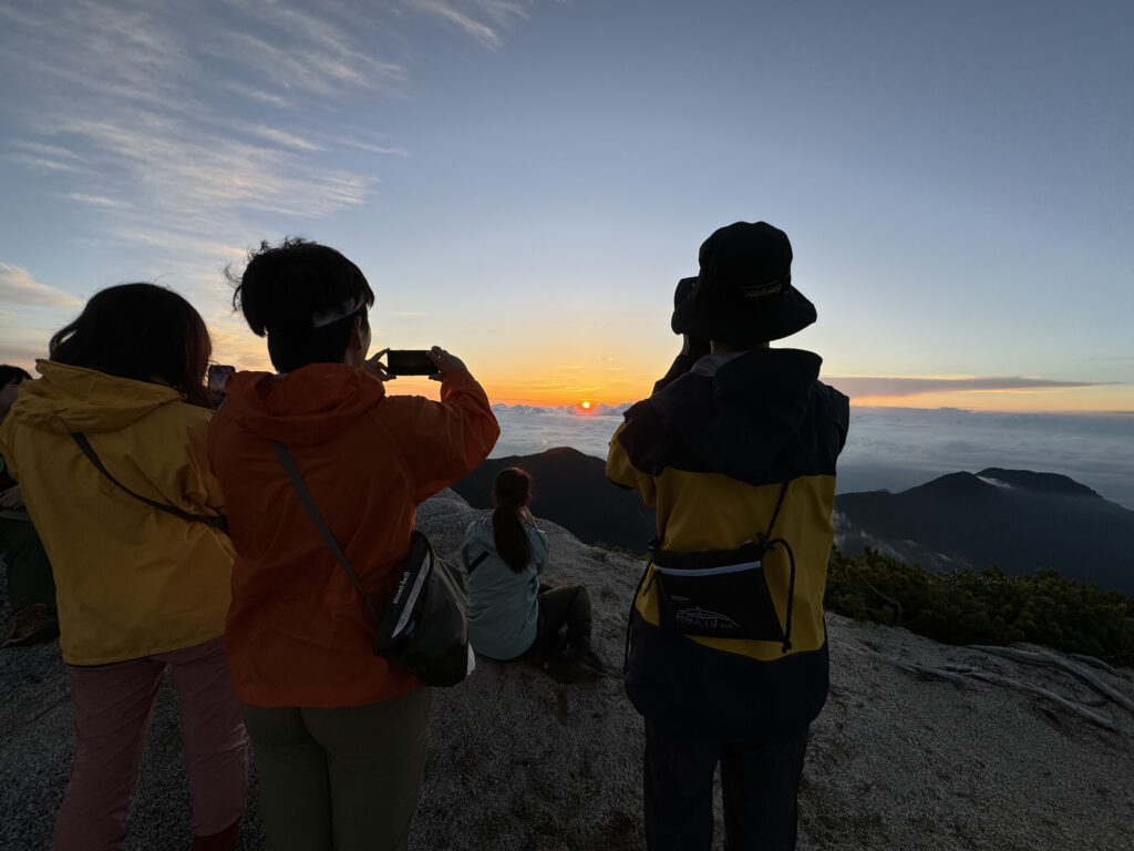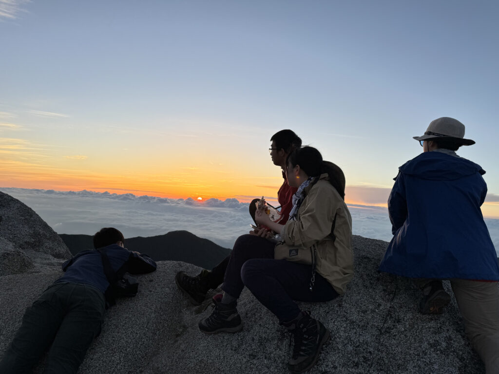2日目の夜、早く寝たので、目覚めが良かったです。朝は肌寒く、星空がよく見えました。けれど、日の出を見るためにゆっくりしている暇はなく、すぐに予定の燕岳の山頂へと向かいました。しばらく歩くと、小屋が立っている山が少しずつ明るくなっていくのが見えました。この時間帯に1番クマが出ると聞いて、結構ビビりながら歩きました。そうこうしているうちに、燕岳山頂に到着しました。けれど、山頂はあまり面積がなくゆっくり休むことも出来ませんでした。また、日の出にはまだ早いので、次のピークの北燕岳に行って朝日を見ようと言われました。