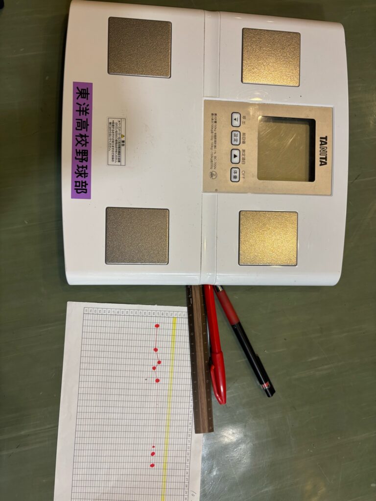 選手たちが3チームに分かれ、そのうち2チームが練習を行うので残りの1チームの選手たちの体重を測り、記録表に記入します。それを3チーム分のローテーションが終わるまで行います。