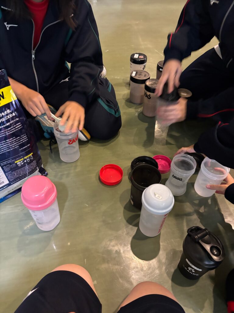 選手たちが準備運動を始めたら、プロテイン用のシェイカーが提出されているかチェックし、出ていない選手に声をかけてシェイカーを出してもらいます。