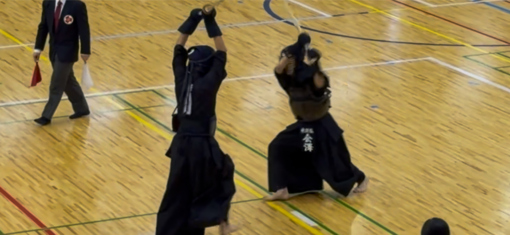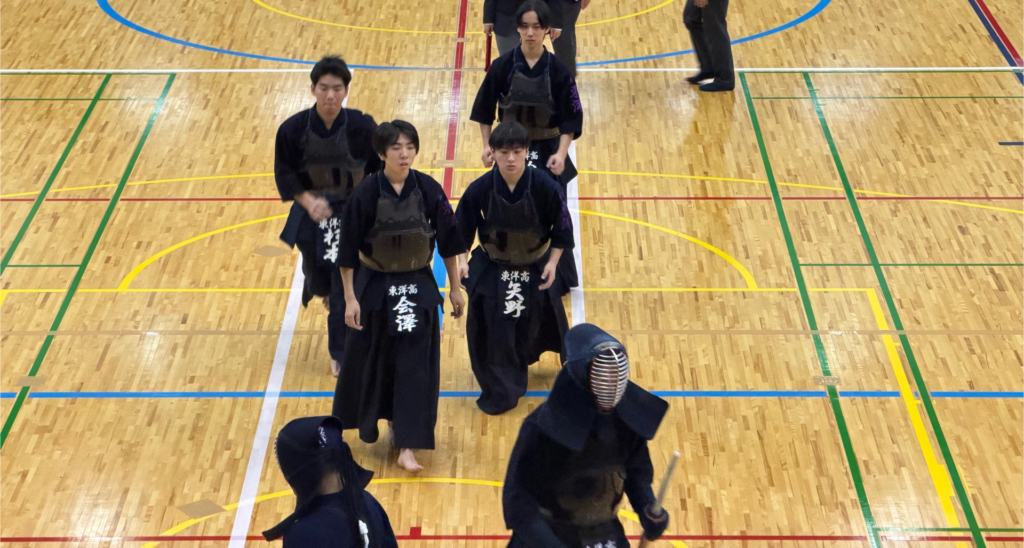1回戦は,都立久留米西高等学校との対戦です。先鋒の杉本くんが開始わずか3秒の電光石火でメンを決め,一気に流れを引き込みました。その後,すぐさま2本目のメンを決め,わずか30秒で東洋に1勝をもたらしました。次鋒の鈴木くんも流れを作る2勝目を挙げ,有利に団体戦を進めていきます。最終的に中堅の矢野くん,副将の會澤くん,大将の石川くんで2勝を挙げ,見事,1回戦突破を決めました。