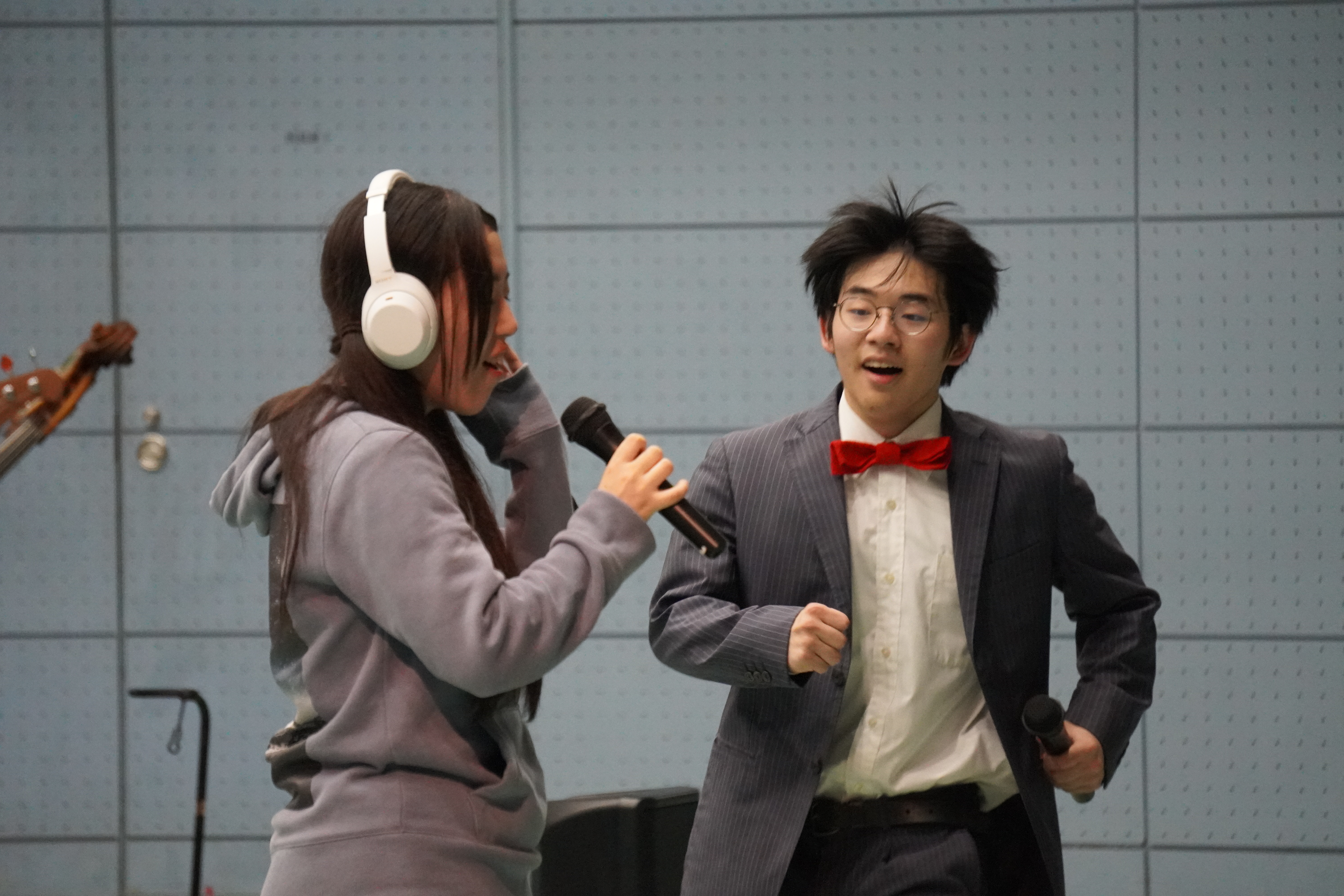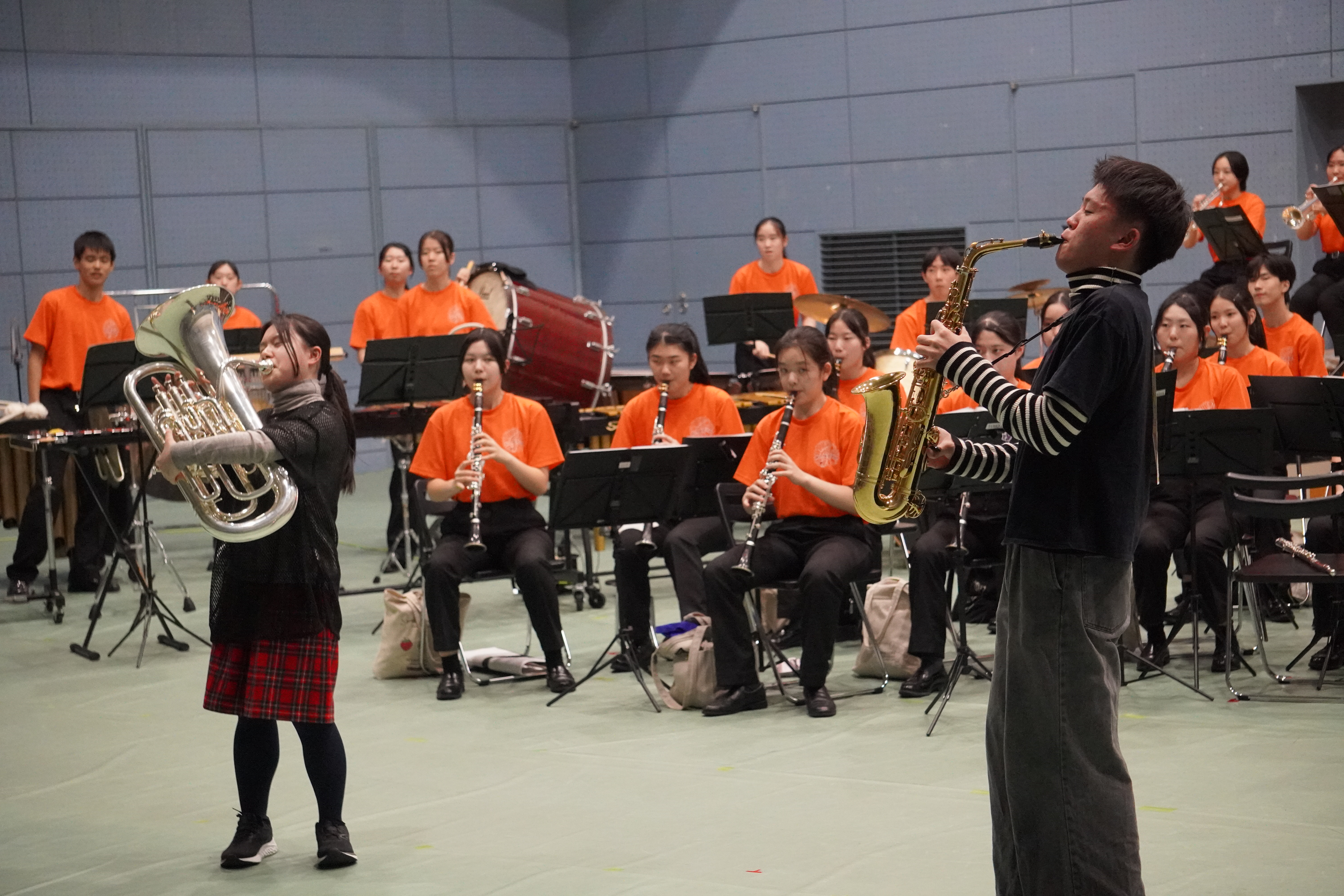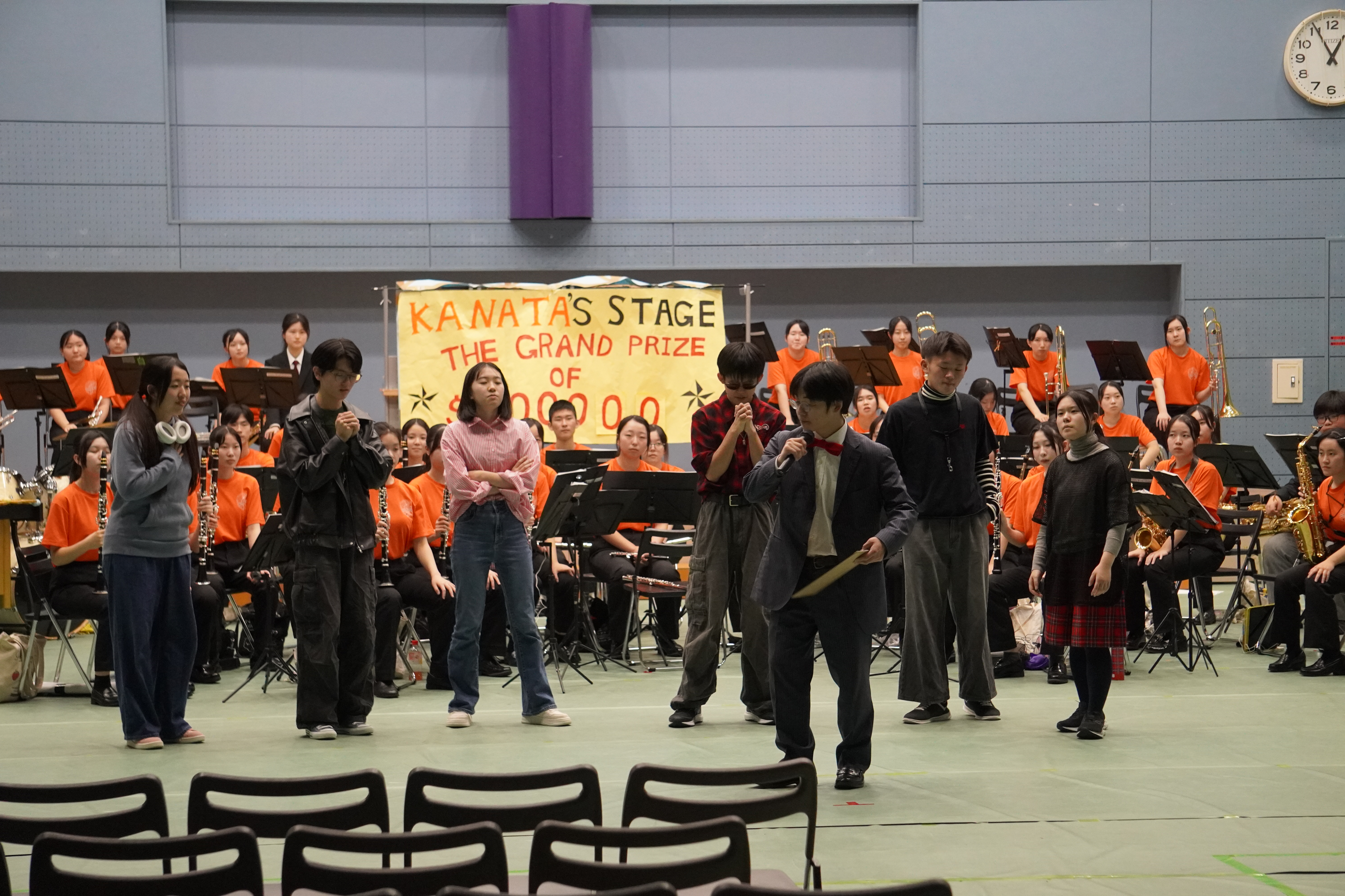 私たちは、昨年度の遥叶(はるか)の代のスタジオジブリ作品をメドレー形式でお送りし、見事グランプリに輝いた音楽劇「スタジオハルカ」を超えることを目標に取り組んでまいりました。我々、奏向(かなた)の代で作り上げた「KANATA’s STAGE」では、構成や脚本、装飾等すべてを部員主体で作り上げてきました。合奏では、演技や台詞、演奏の音量バランスや噛み合わせにおいて試行錯誤を重ねました。今年もグランプリをいただくことができ、一つ目標を達成できた喜びと同時に、この公演を通して、演奏面の課題を再認識し、自分たちのするべき練習について考える良い機会となりました。年明けの新人大会に向けて部員一丸となって取り組んでまいります。