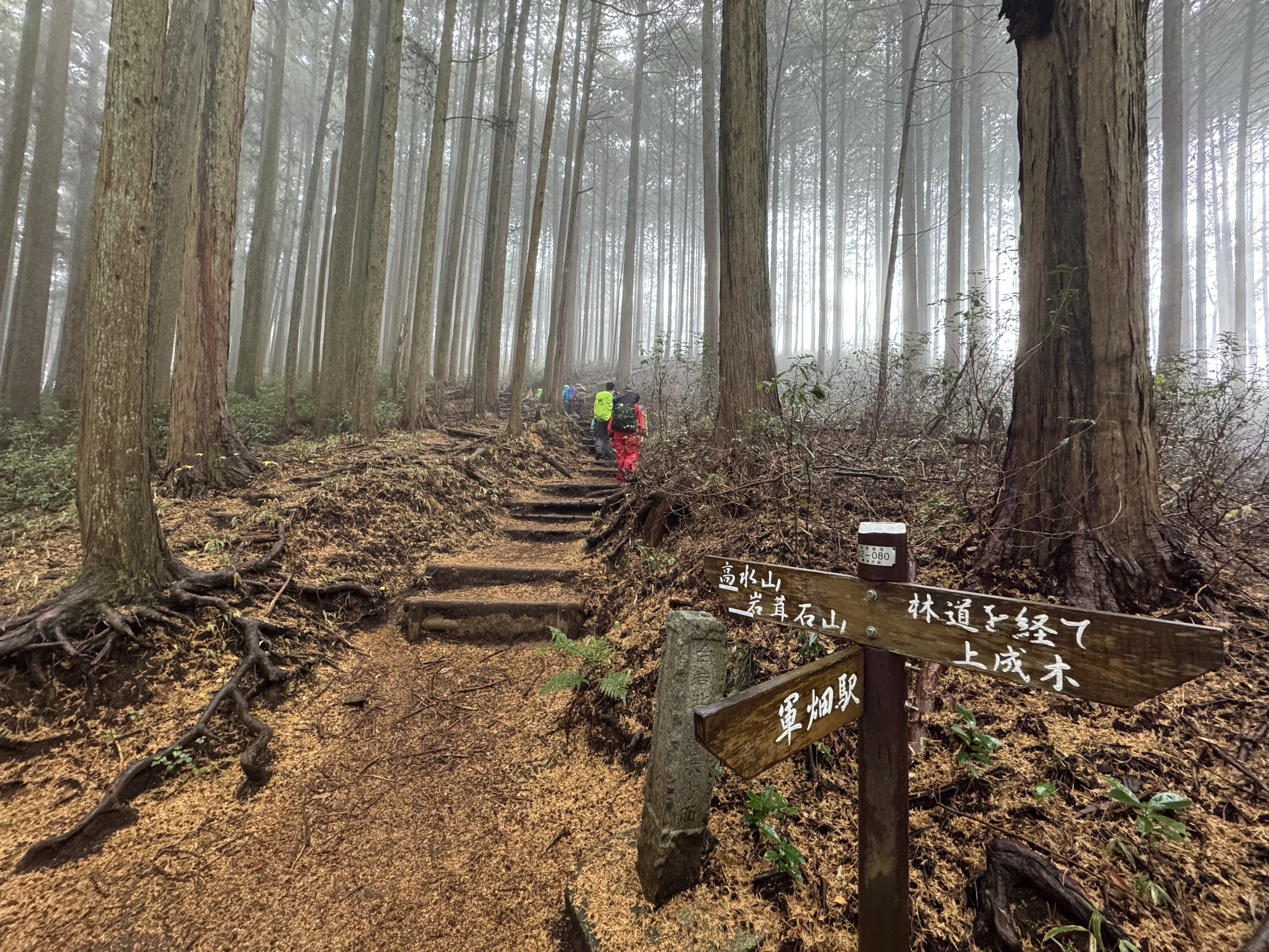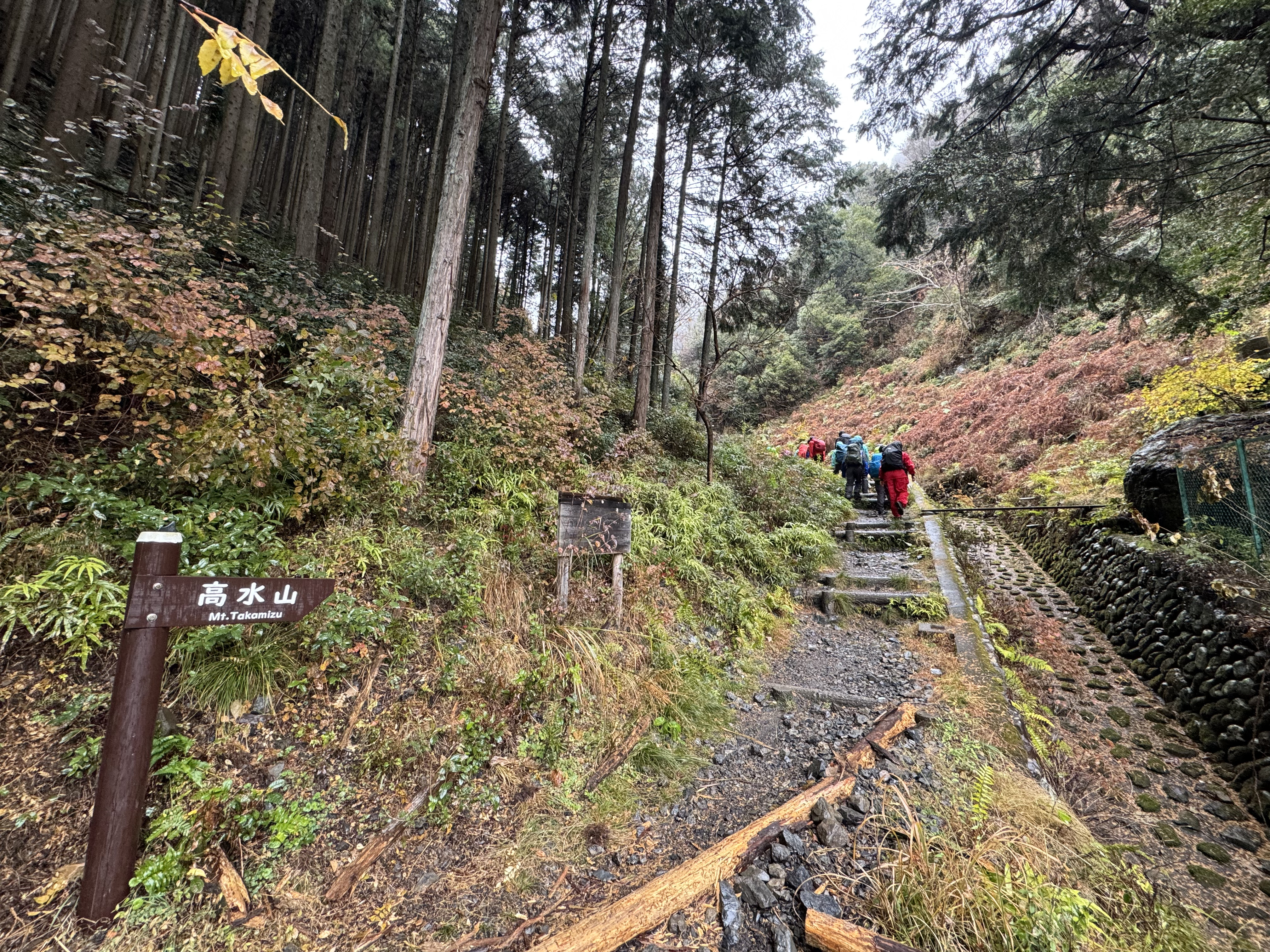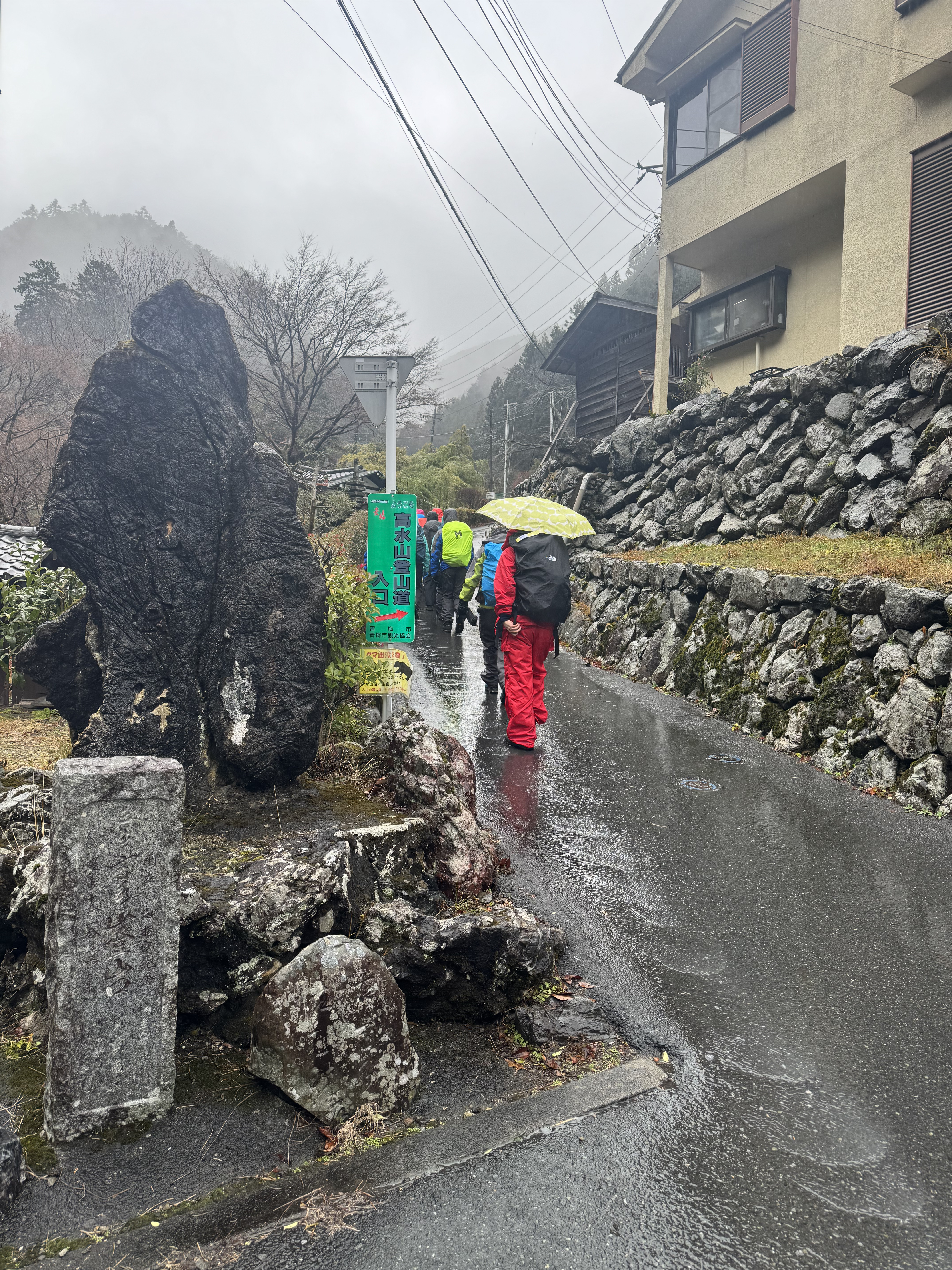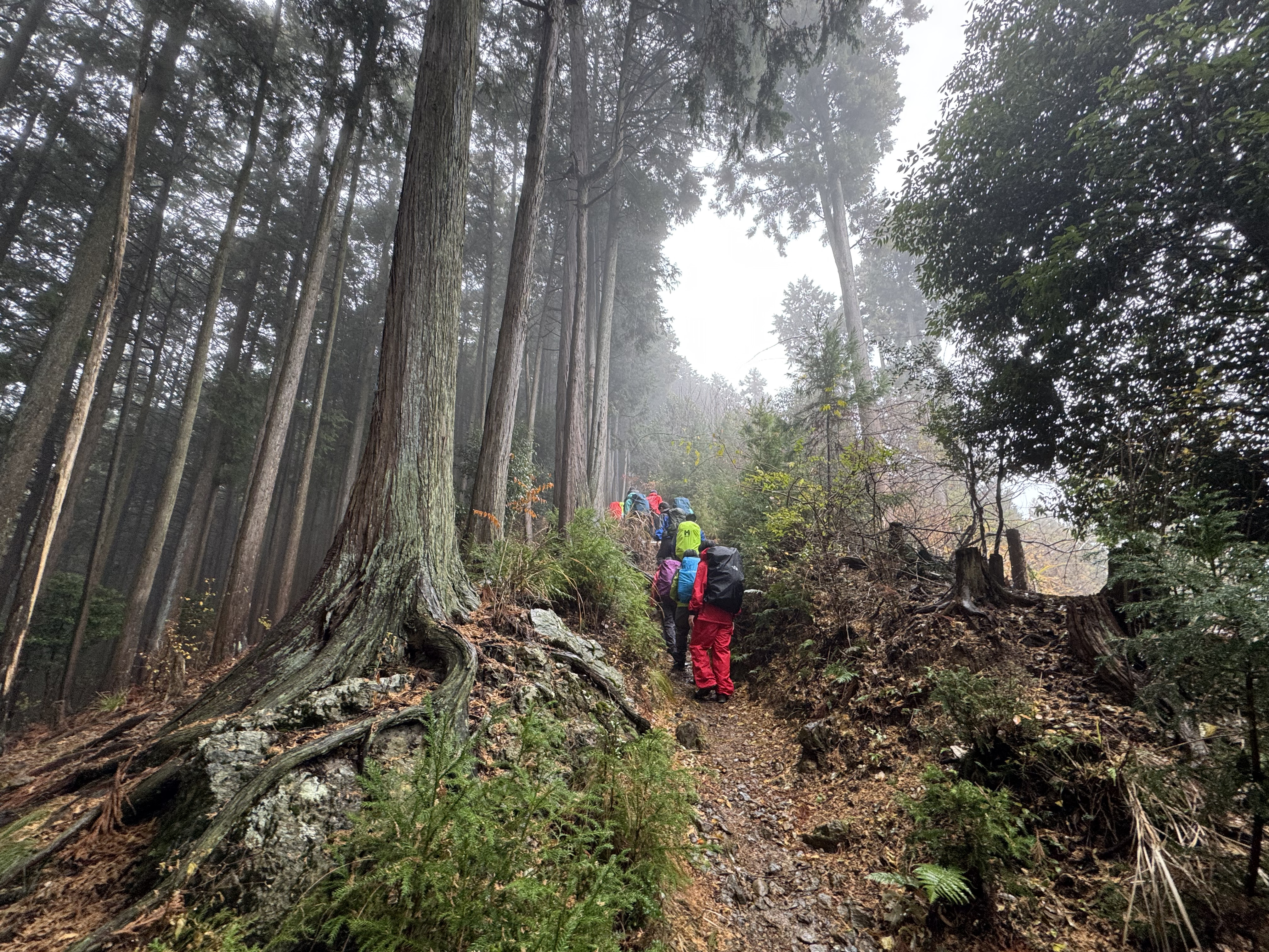 当日はあいにくの雨で、集合場所の軍畑駅を出発して登山道に入るまでの間は雨が降っていました。レインウェアとザックカバーを着用し、雨対策をしっかり行った状態で歩き始めました。