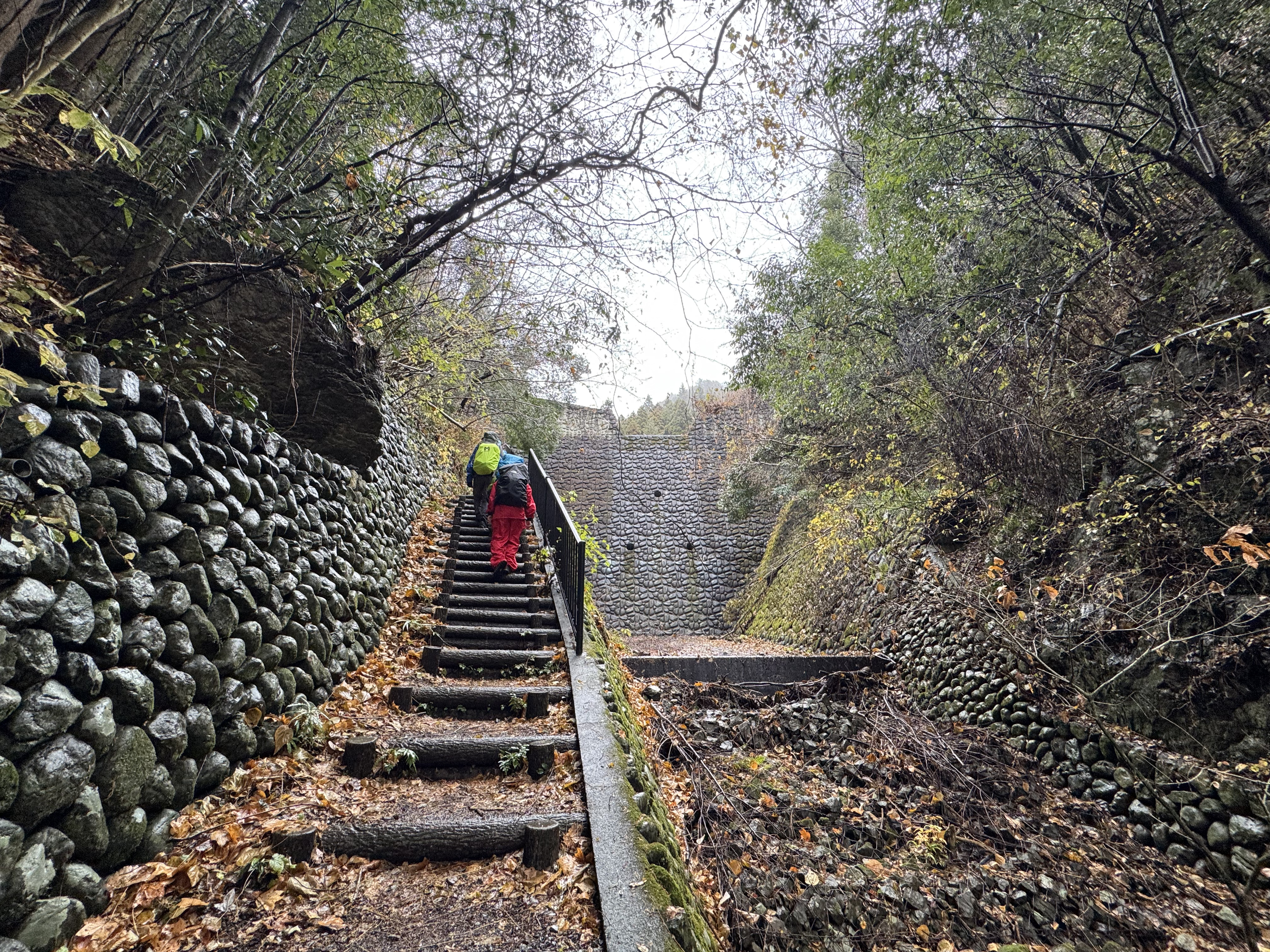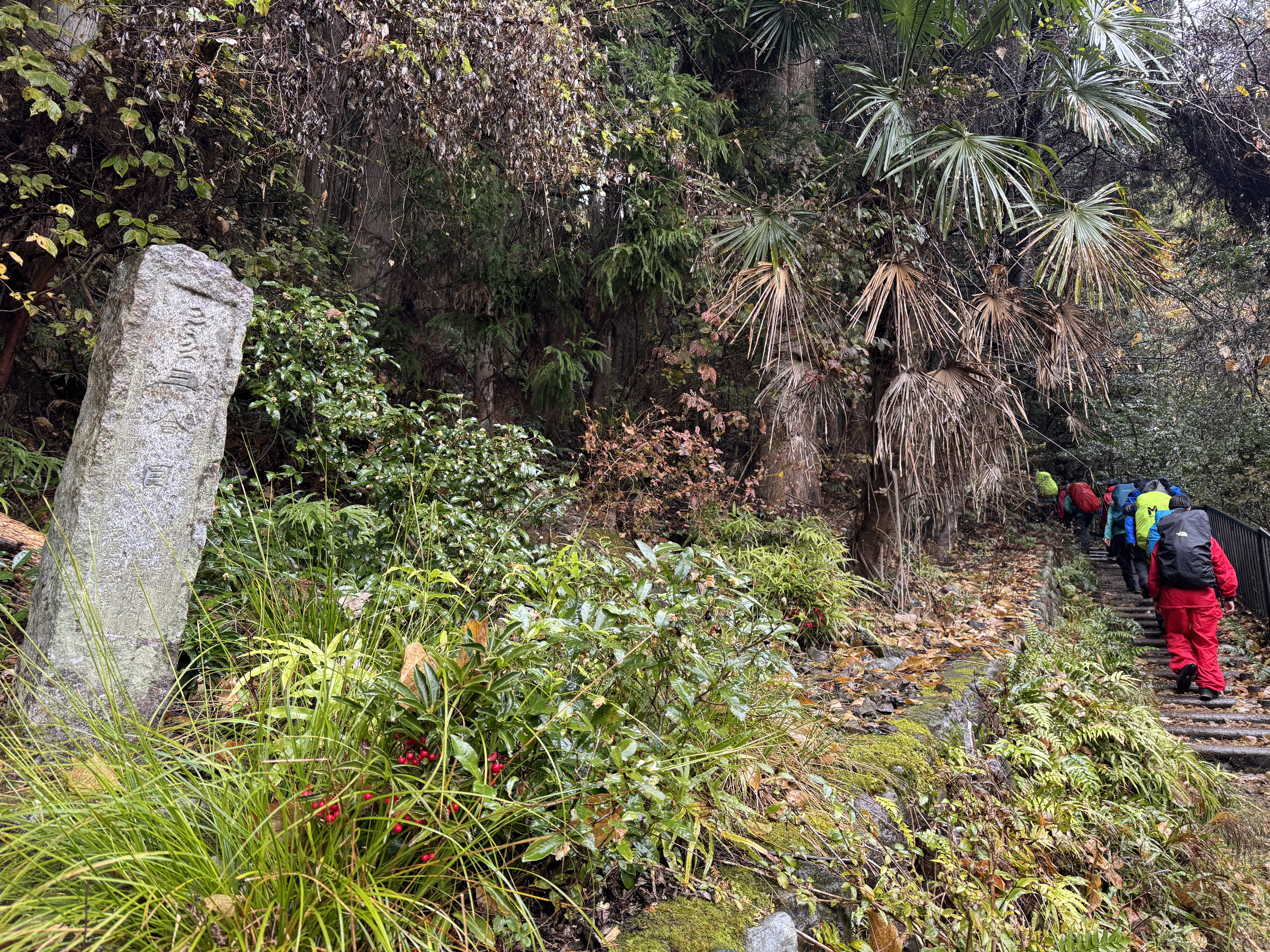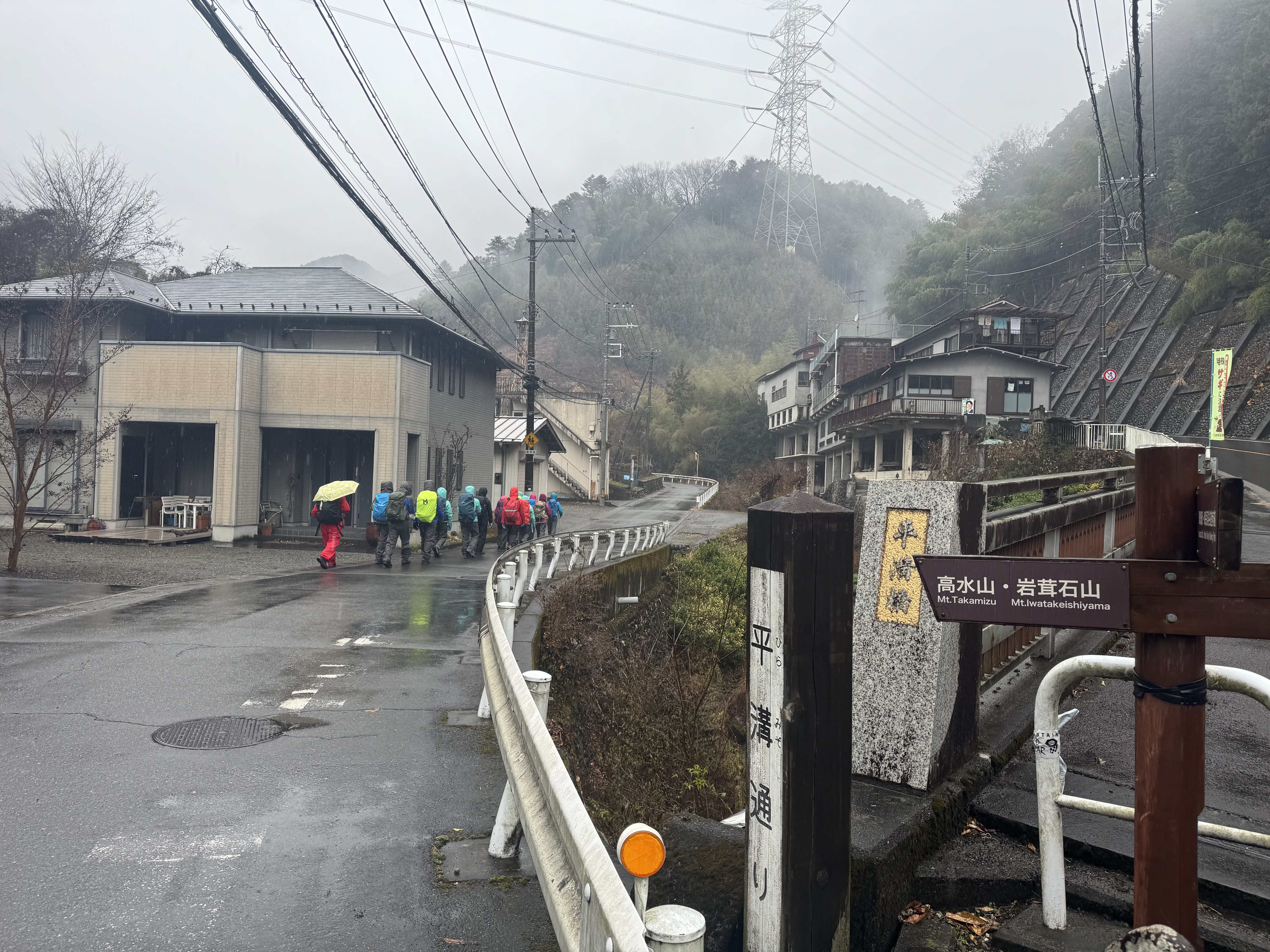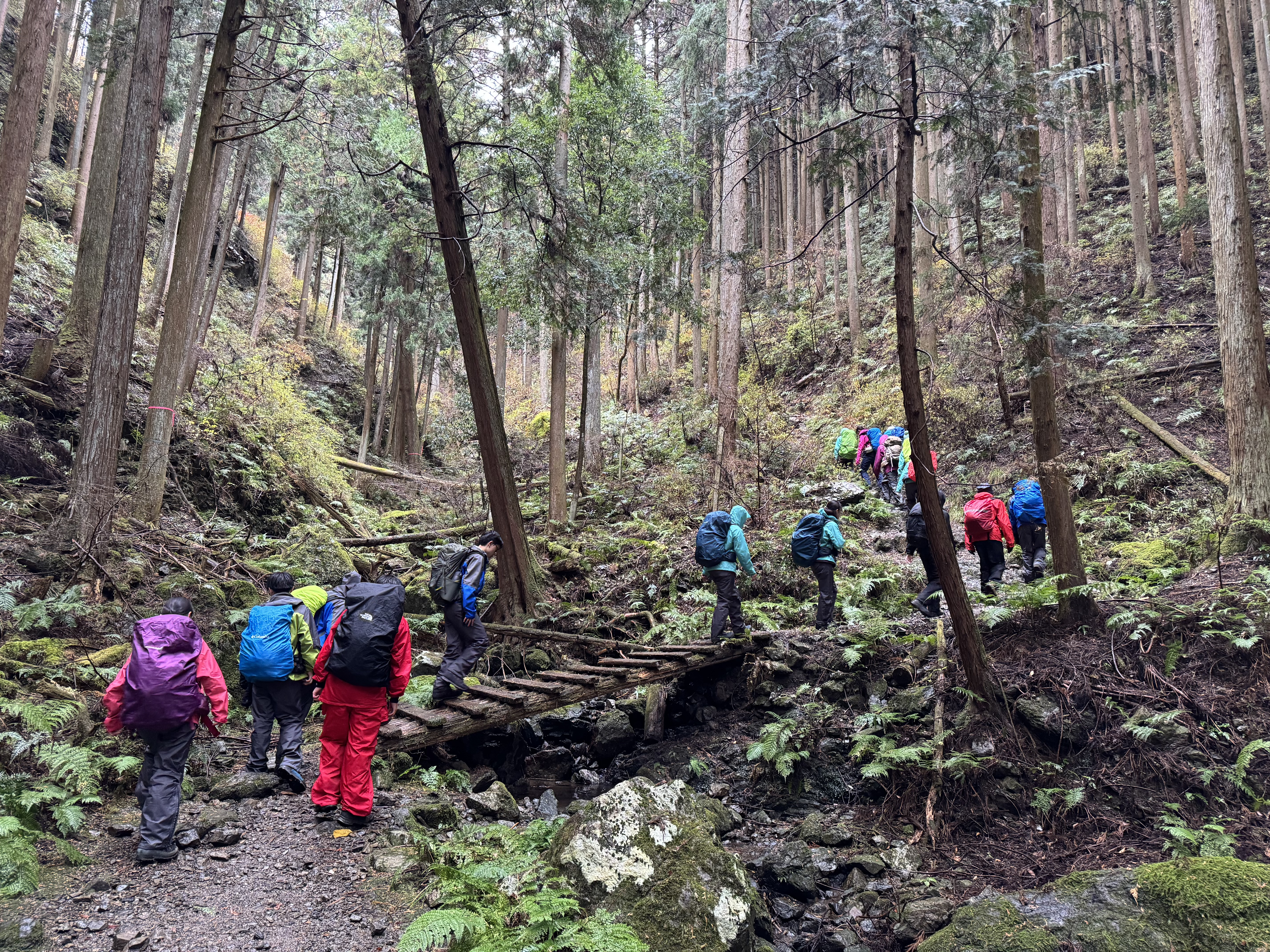 当日はあいにくの雨で、集合場所の軍畑駅を出発して登山道に入るまでの間は雨が降っていました。レインウェアとザックカバーを着用し、雨対策をしっかり行った状態で歩き始めました。