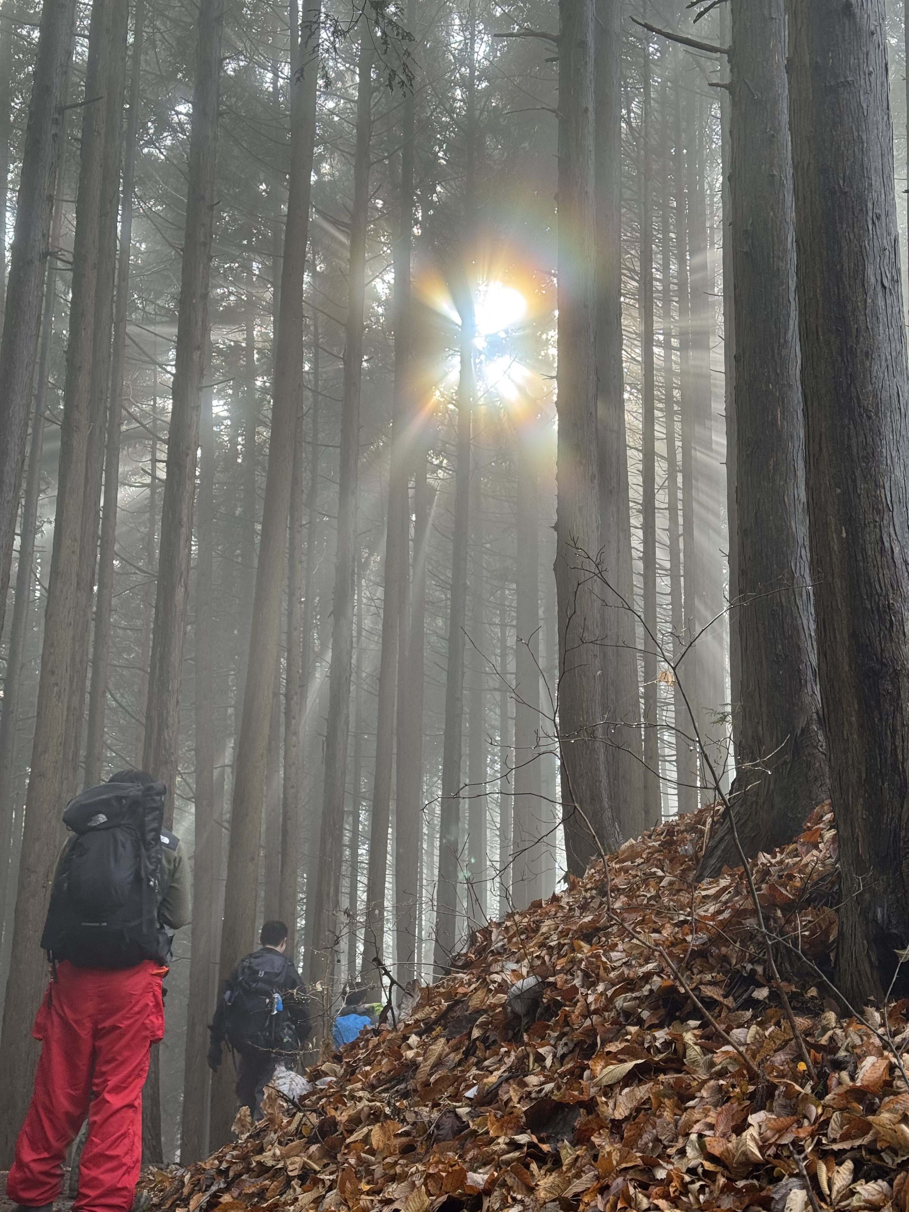 登っていくうちに次第に雨は弱まり、昼食の時間には空は曇ってはいたものの雨は止みました。昼食ではバーナーを使ってカップラーメンを作っている人もいて、雨の中を歩いた後だったので、温かい食事が体に沁みました。