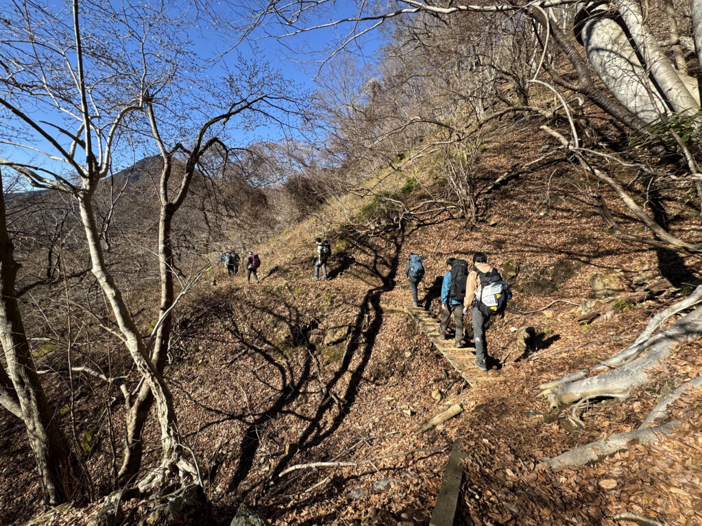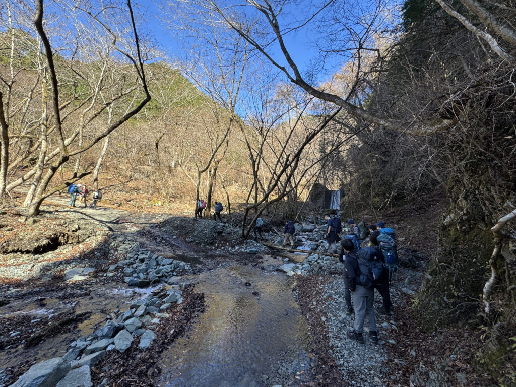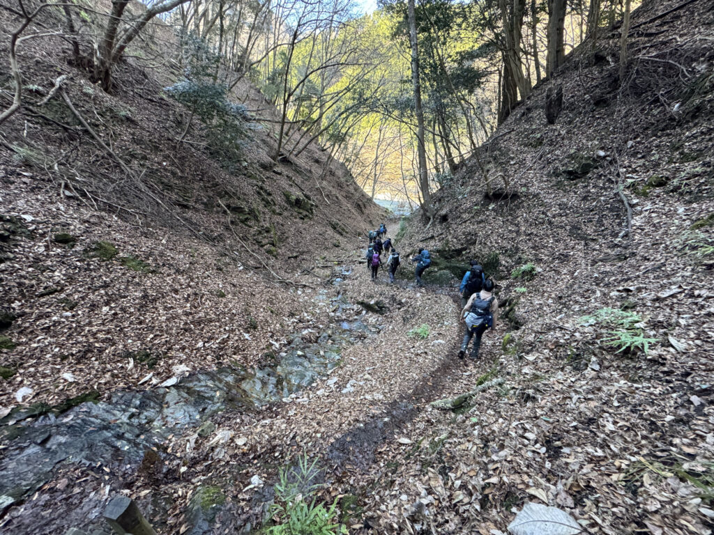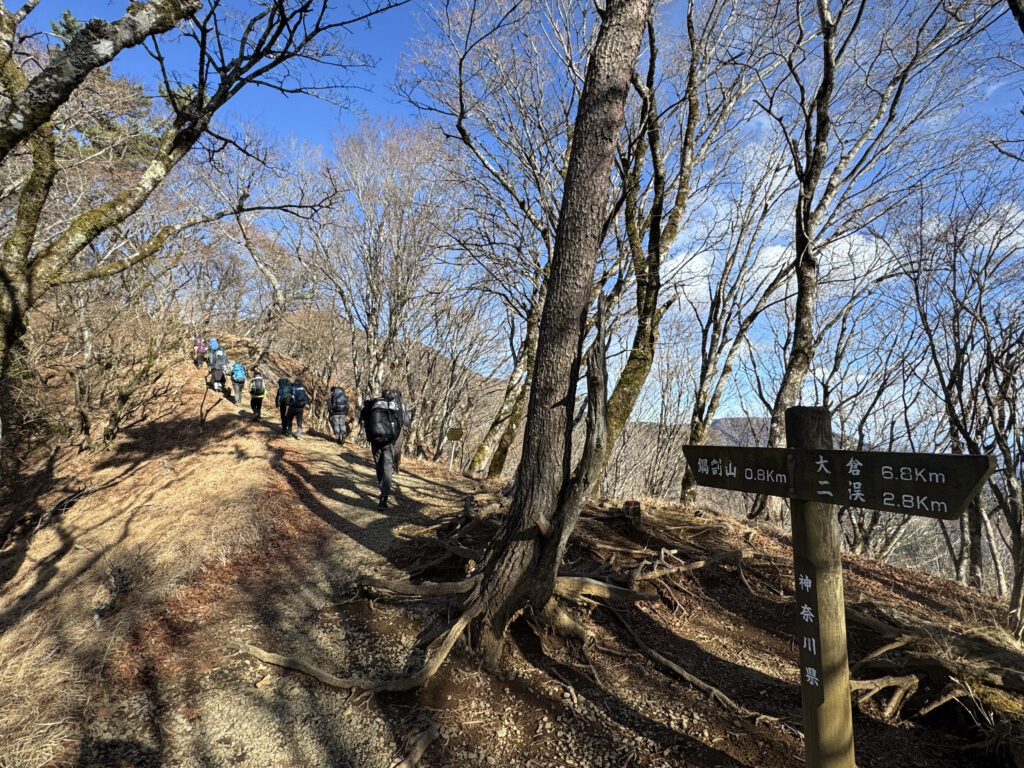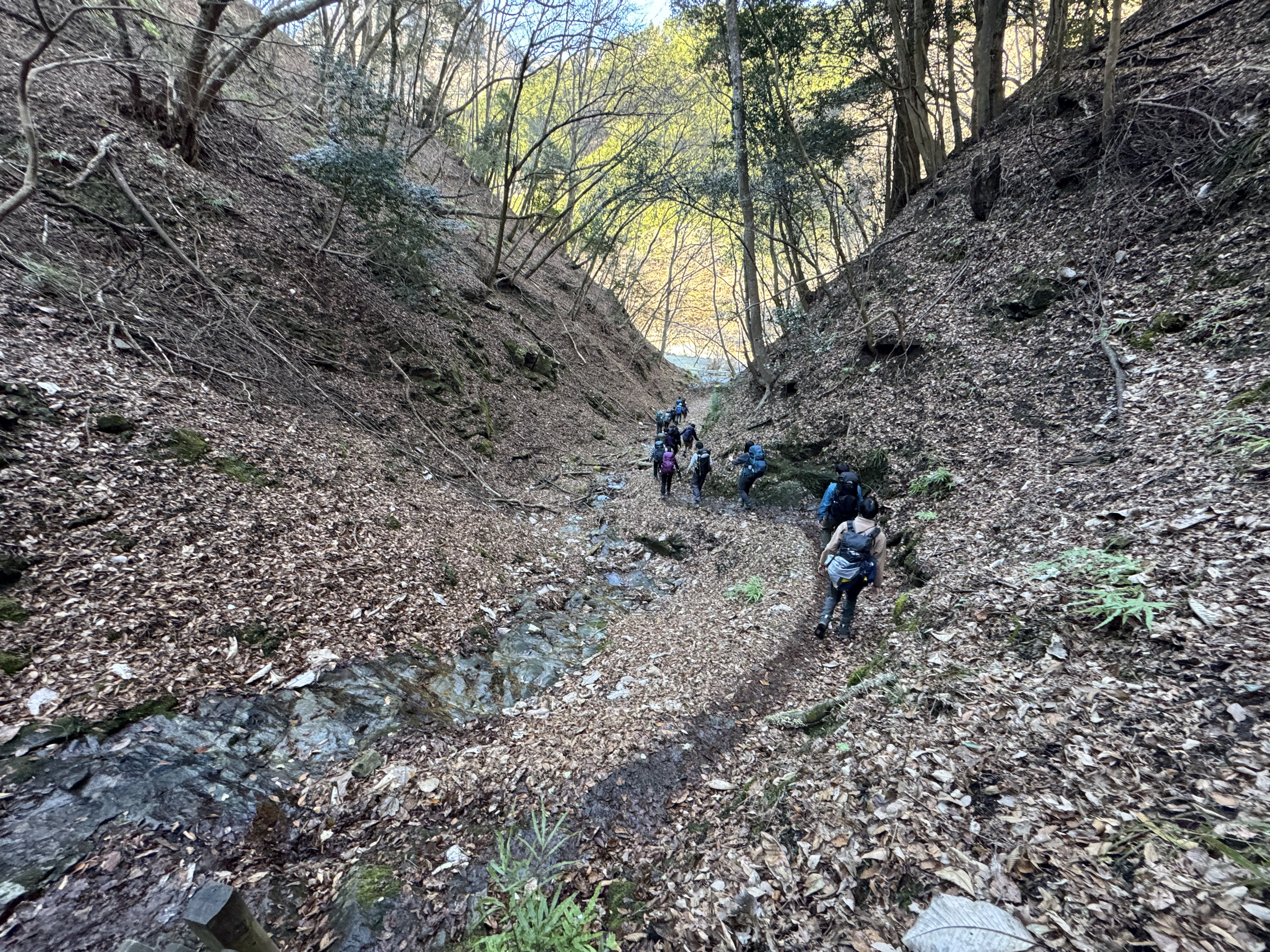 まずは渋沢駅から15分ほどバスに乗り、大倉バス停に向かいます。バス停に着いた頃は真冬とはいえ強い日差しに暑さを覚えました。バス停から登山口まで少し距離があり、道路を歩くと標高が高いから見渡せる神奈川の朝の街が見えてとても綺麗でした。ここからさらに歩き、落ち葉の多い林の様な道を抜け登山口に着きました。歩いている途中には何本か大きめの川があり、橋を渡って進んでいましたが、橋が掛かっていない場所が2か所ありました。ガイドのAさんが先駆けて道を確認してくださり、みんなで石を伝って渡りました。ちなみに何人かは川に落ちて靴の中が少し濡れていました。