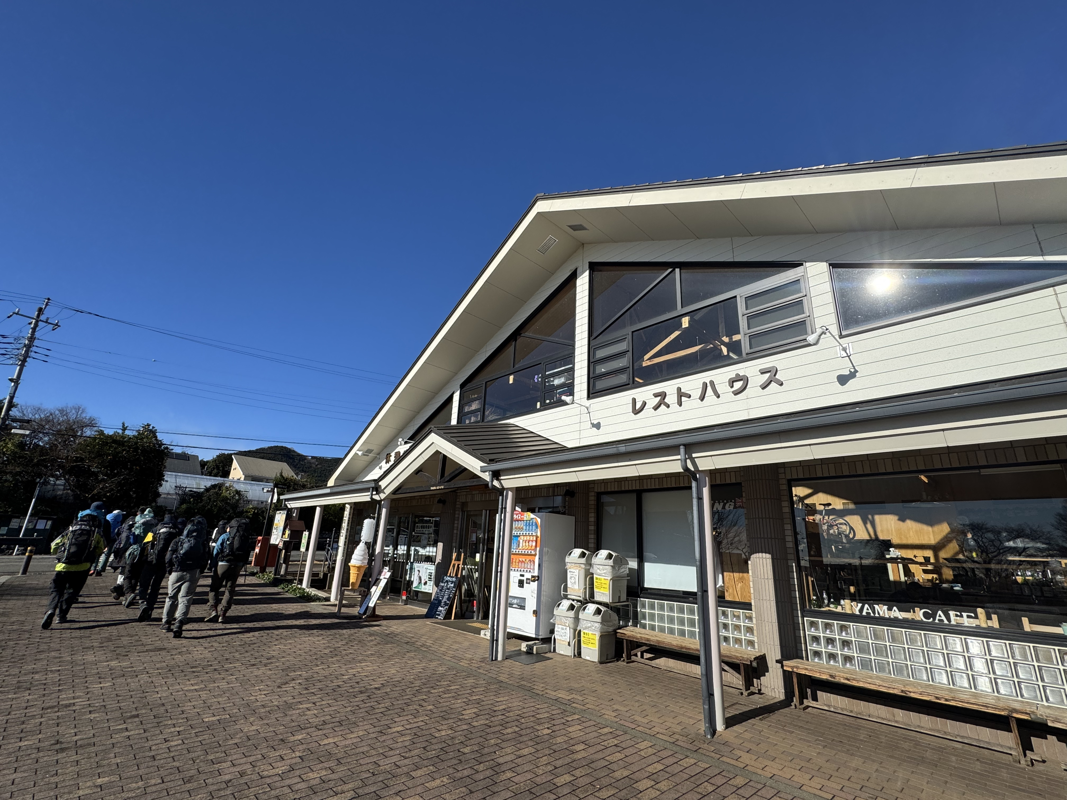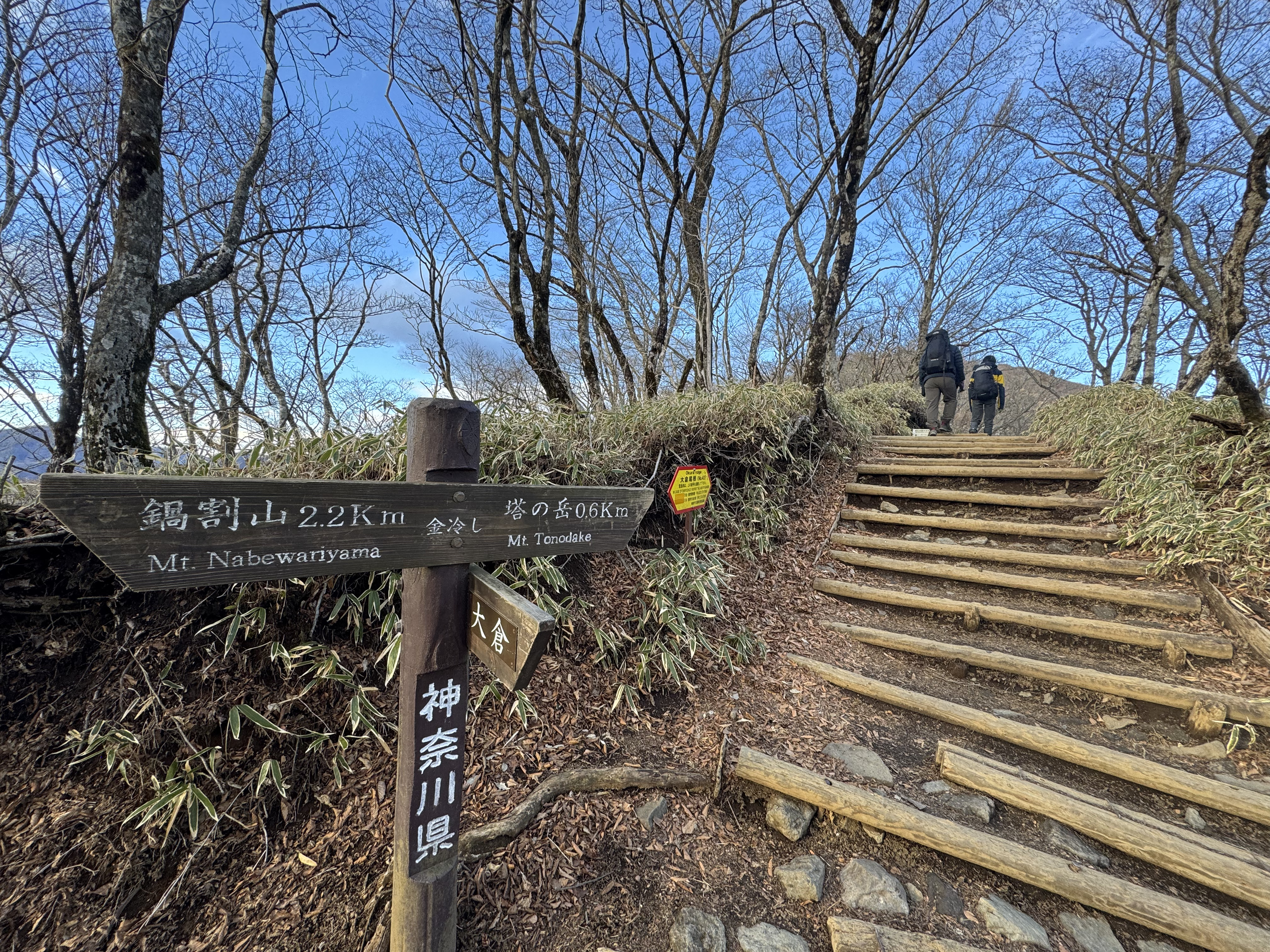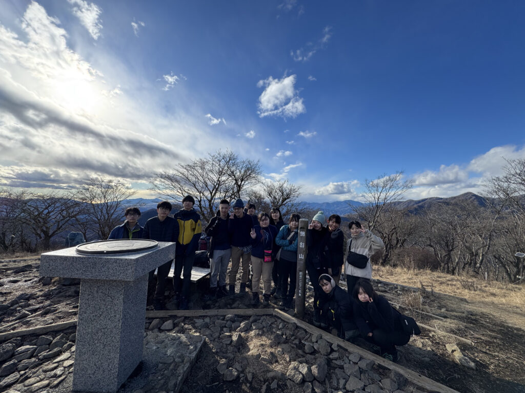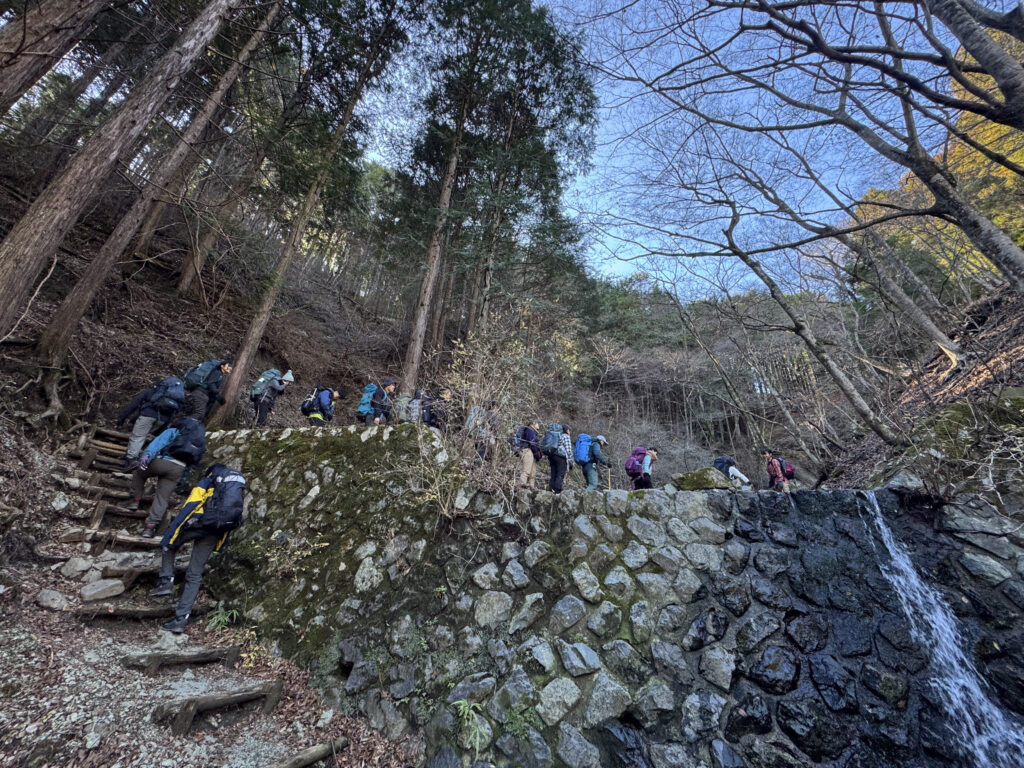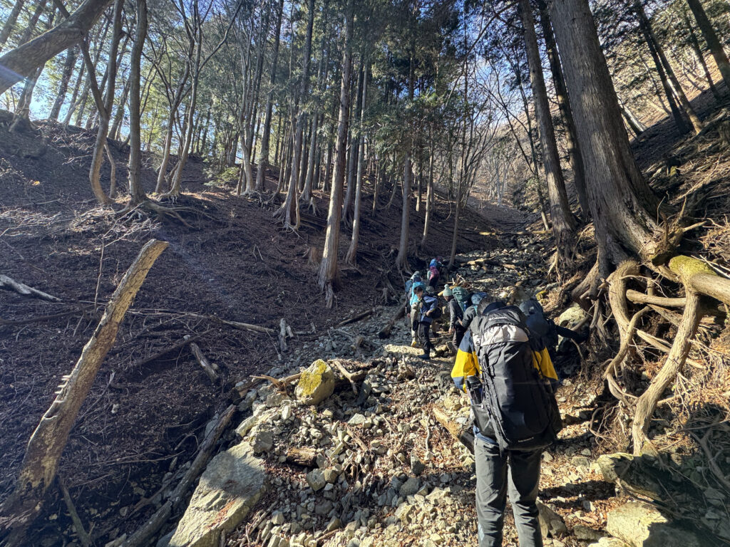 まずは渋沢駅から15分ほどバスに乗り、大倉バス停に向かいます。バス停に着いた頃は真冬とはいえ強い日差しに暑さを覚えました。バス停から登山口まで少し距離があり、道路を歩くと標高が高いから見渡せる神奈川の朝の街が見えてとても綺麗でした。ここからさらに歩き、落ち葉の多い林の様な道を抜け登山口に着きました。歩いている途中には何本か大きめの川があり、橋を渡って進んでいましたが、橋が掛かっていない場所が2か所ありました。ガイドのAさんが先駆けて道を確認してくださり、みんなで石を伝って渡りました。ちなみに何人かは川に落ちて靴の中が少し濡れていました。