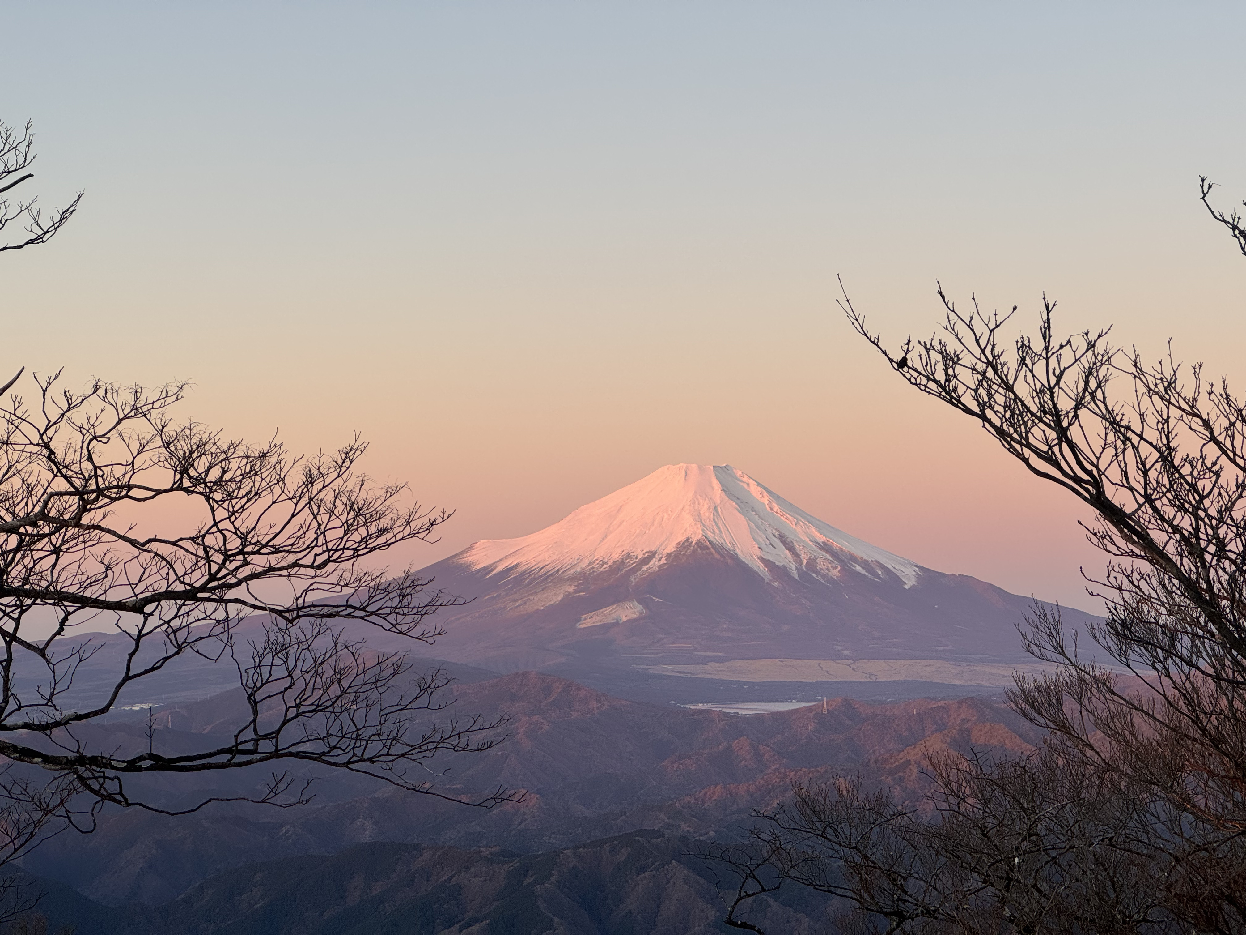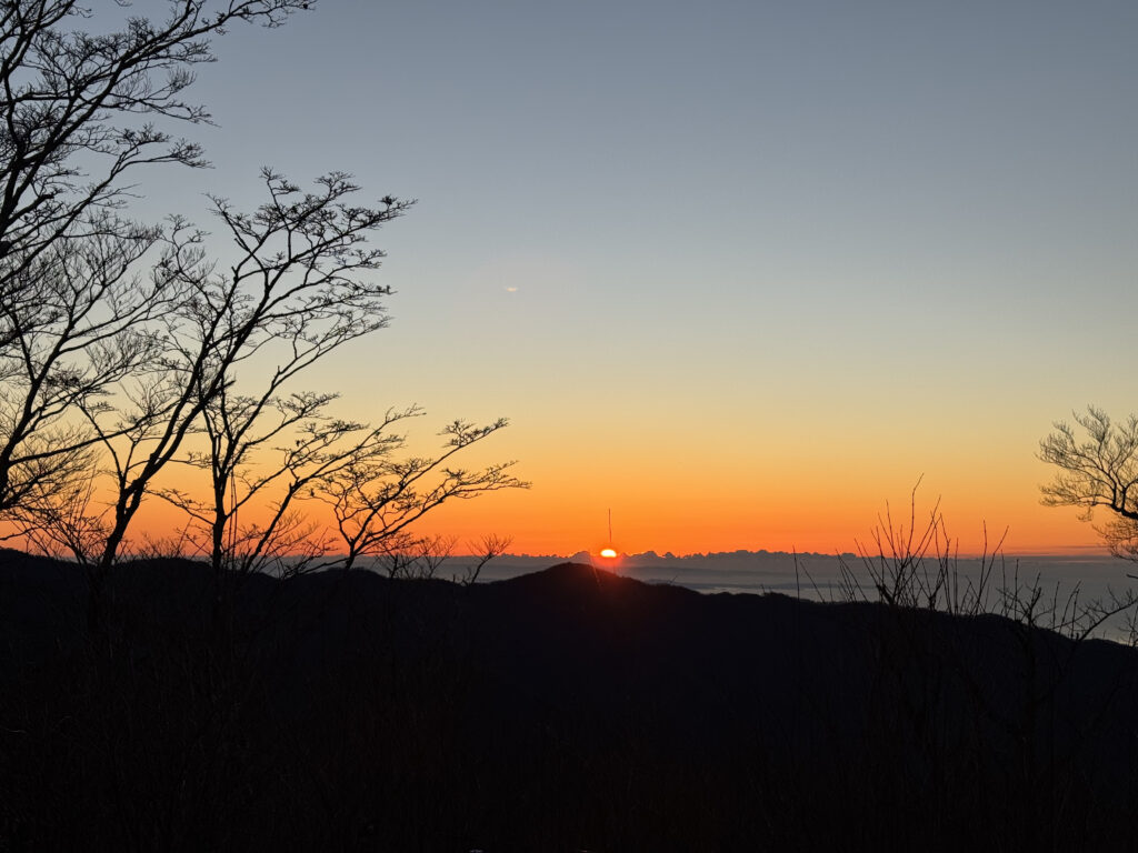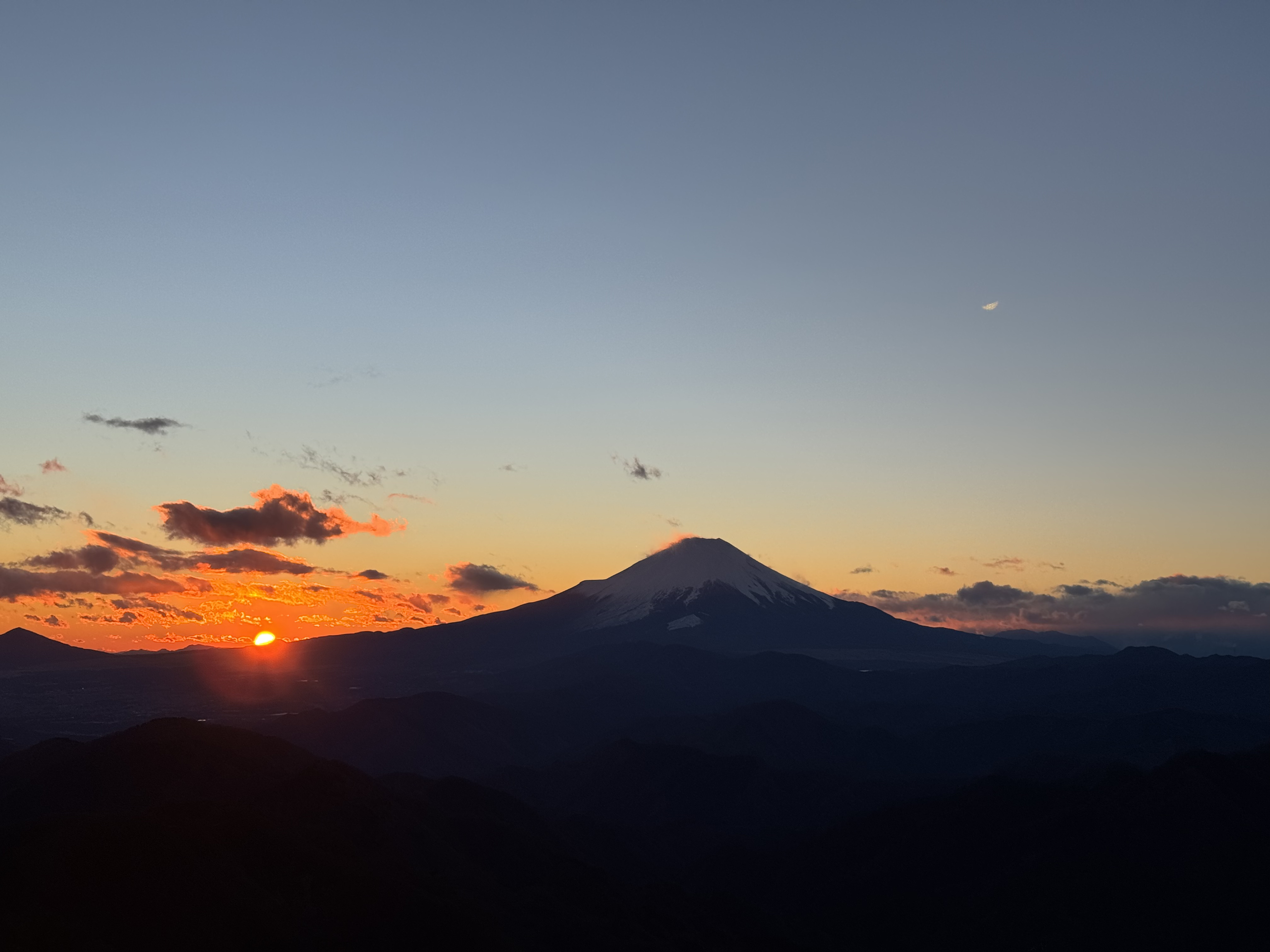 山荘の管理人さんに挨拶をして中に入ると、暖かいストーブがあり、今日の苦労が報われるのを感じました。少しして外に出ると神奈川の夜景と夕日に赤く照らされる富士山をみることができました。とても綺麗でした。ちなみにその時の気温は−6℃。景色を楽しんだ後、夕食を食べて、トイレが無臭なことに驚き、短い自由時間を過ごして20時に就寝しました。