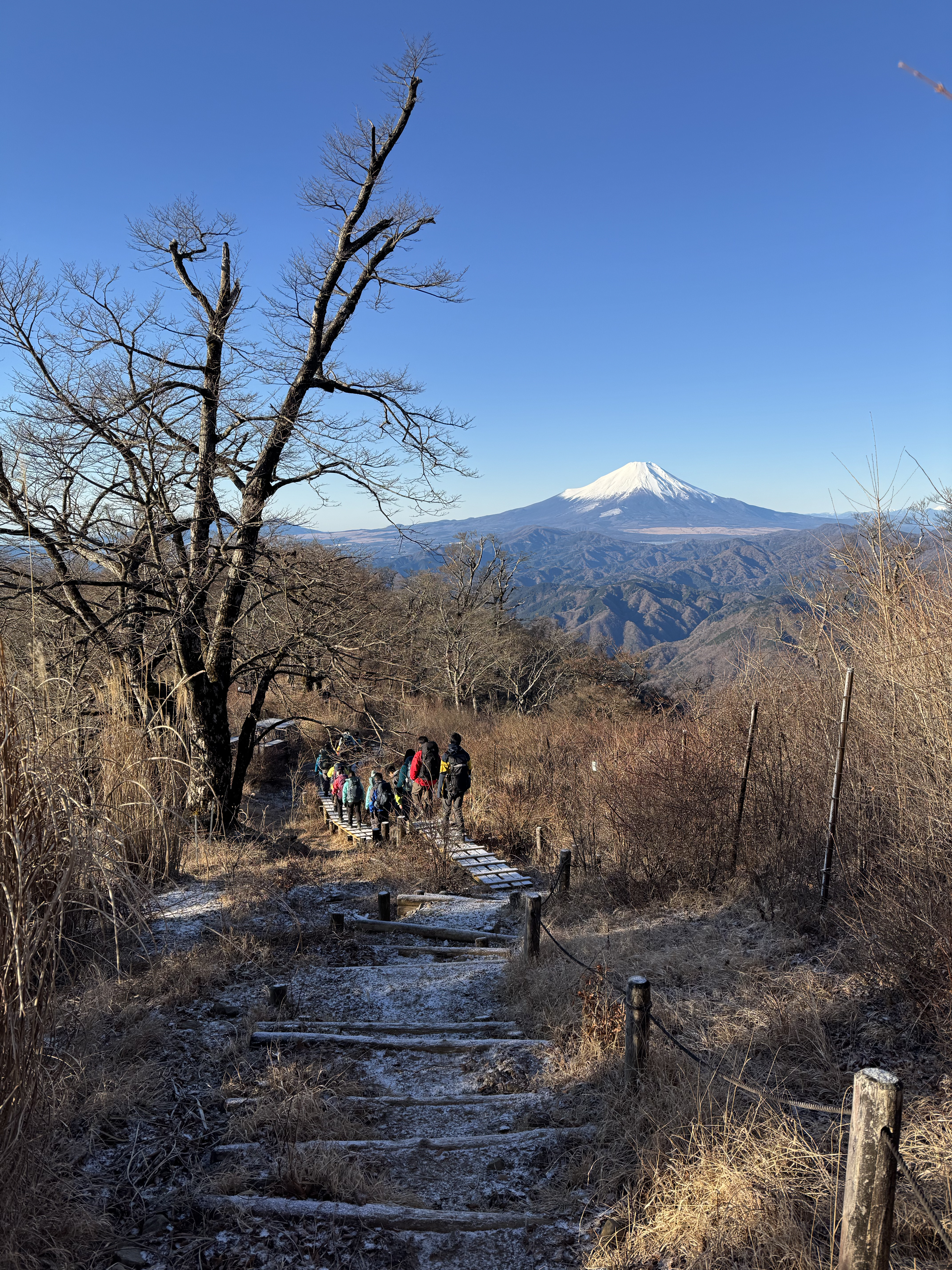 2日目、曇りで凍りつくように寒かったのがまるで嘘のように、3日目は雲ひとつない快晴で富士山が全身見えていました。標高が下がり、富士山も隠れていくにつれて積もっていた雪もなくなり、歩きやすくなっていきました。