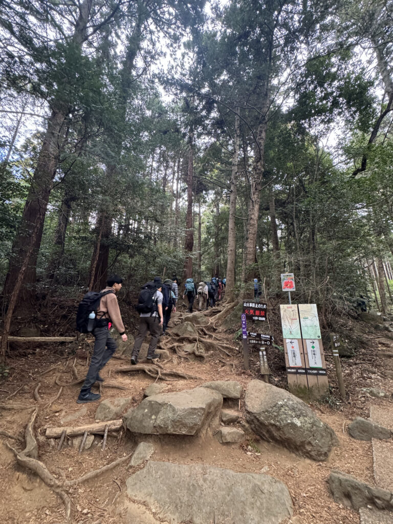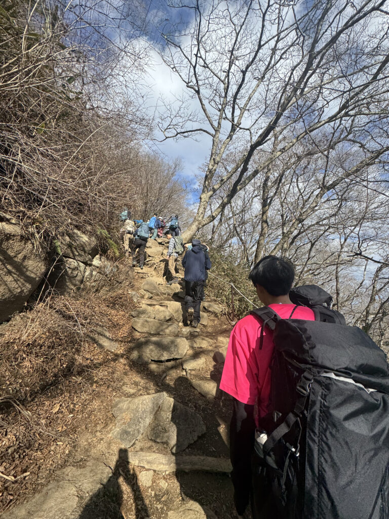前日に雪が降ったので、「もしかしたら雪が残っているかも? 」とワクワクしながら現地へ向かいました。しかし当日は雲ひとつない晴天で、想像していた冬山とは打って変わって、歩いていると暑く感じるほどの陽気でした。中には半袖で歩く人もいるほどで、冬とは思えないコンディションの中での登山となりました。