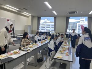 保護者の皆さんからピザとドーナツの差し入れをいただき、顧問の先生からはチキンをいただきました。お菓子もたくさん用意して、ビンゴやジェスチャーゲームなども盛り上がりましたが、恒例の1年生による一発芸大会は一番の盛り上がりでした!