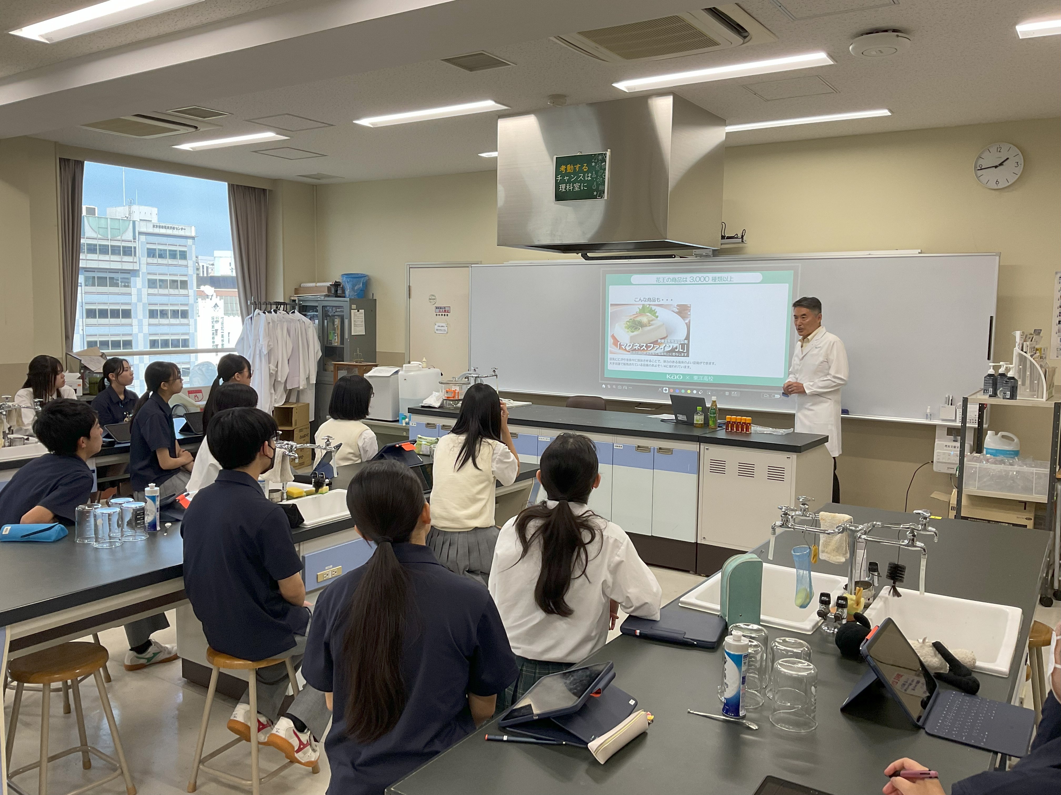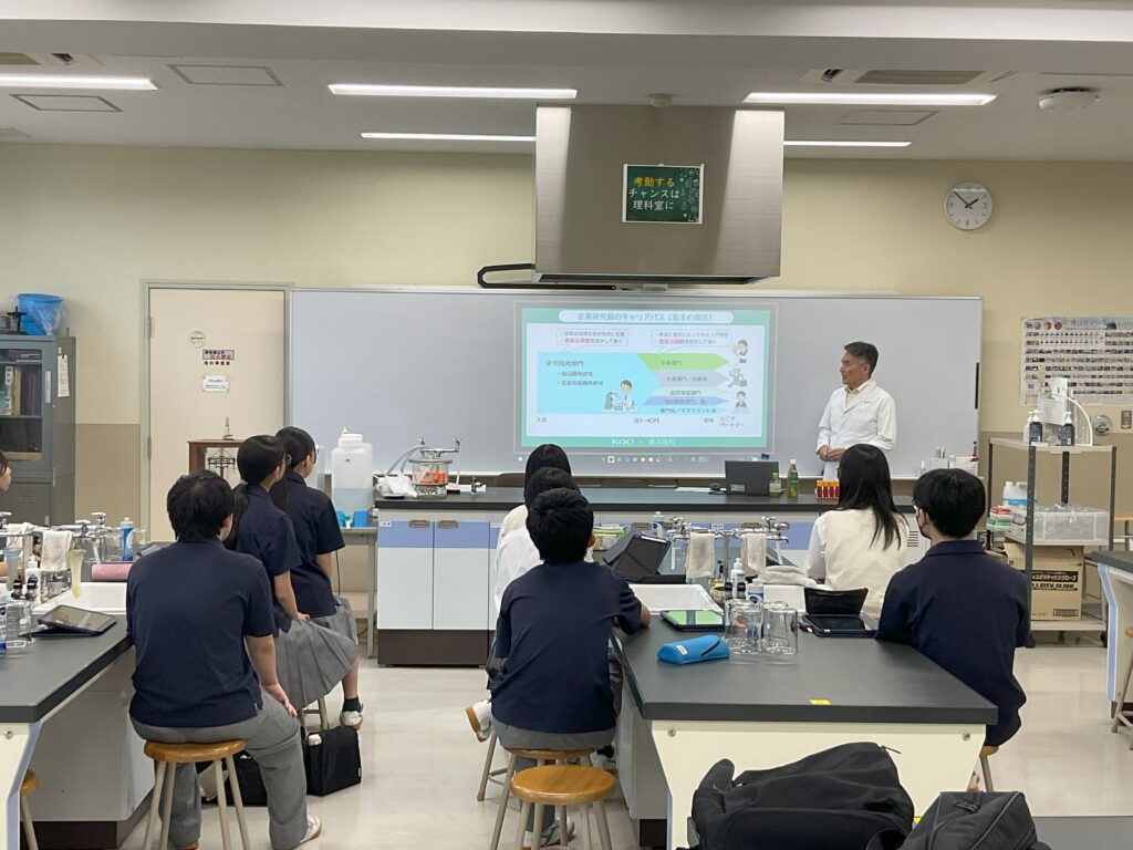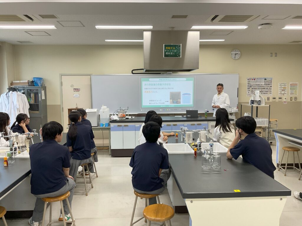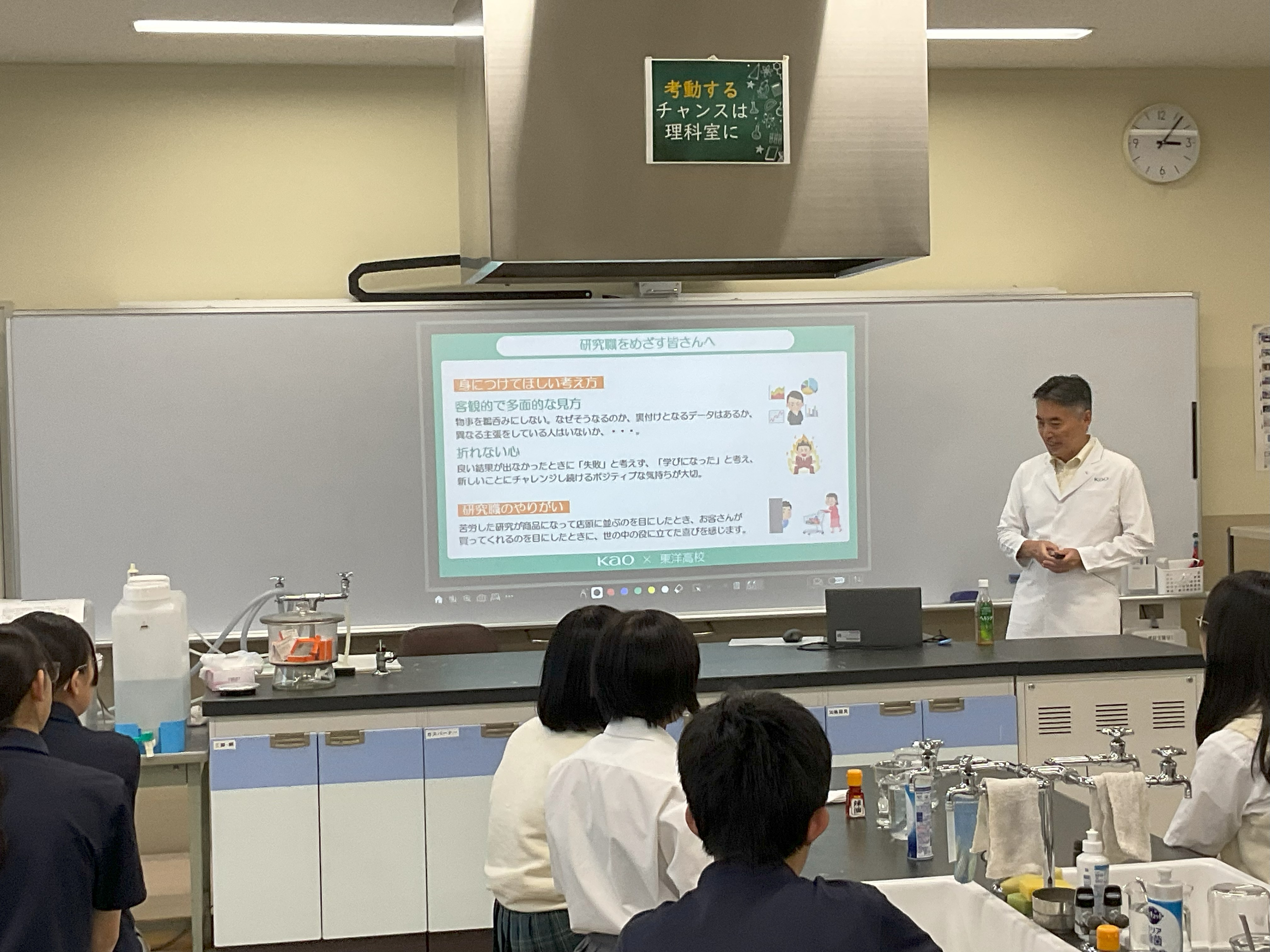 8月26日(火)の午後に花王株式会社の研究員を講師としてお招きし、本校理科室にて出張授業(理科&キャリア教育)を実施していただきました。当日は1~3年生10名が参加しました。参加した生徒は文理選択に悩んでいる1年生から理系分野での大学進学を強く志している3年生まで幅広く、前半のキャリア教育では自身の将来について、後半の食器用洗剤を用いた実験では身近な所にある科学の力について触れ、自身の将来を考える良い機会となりました。