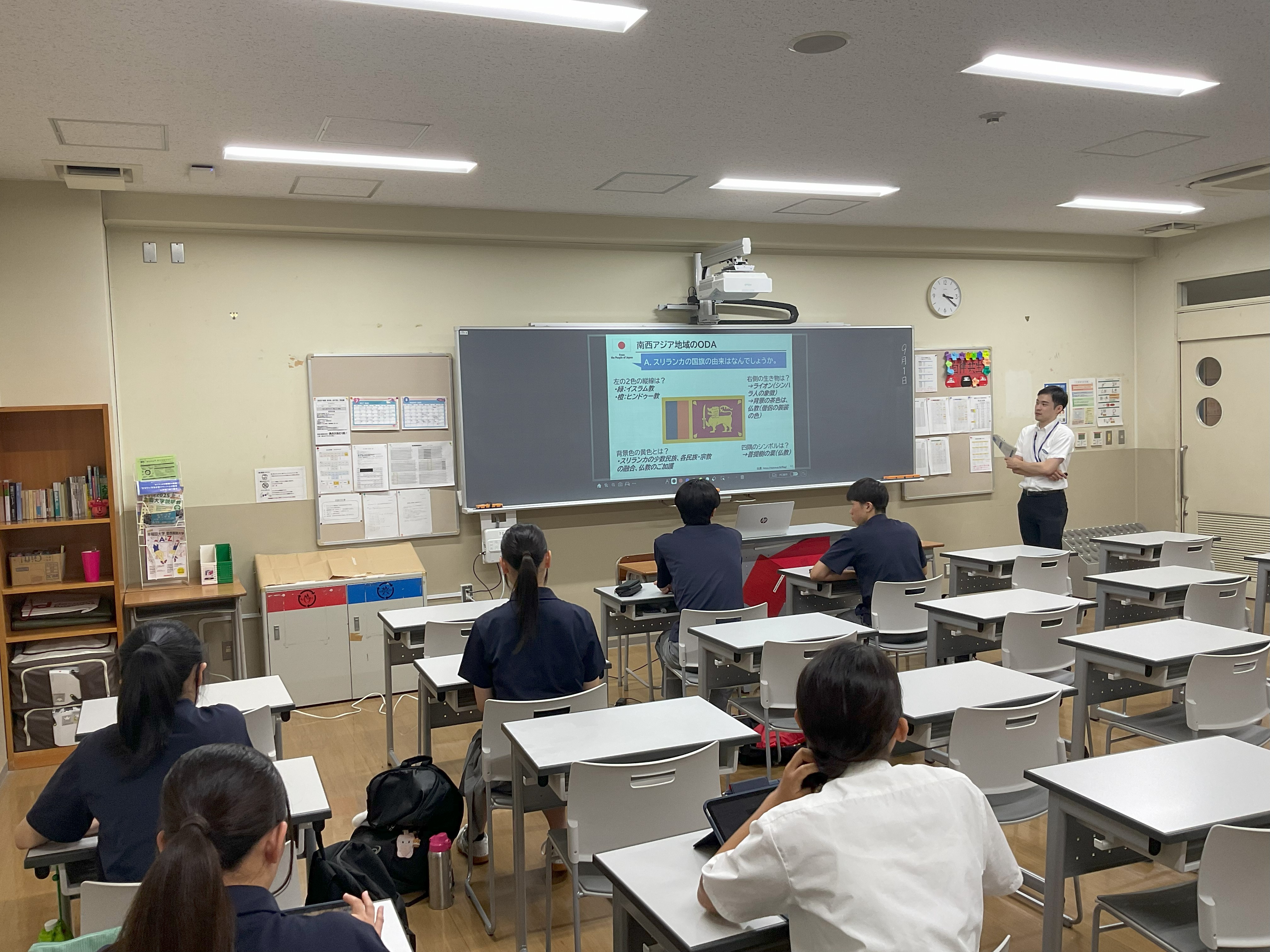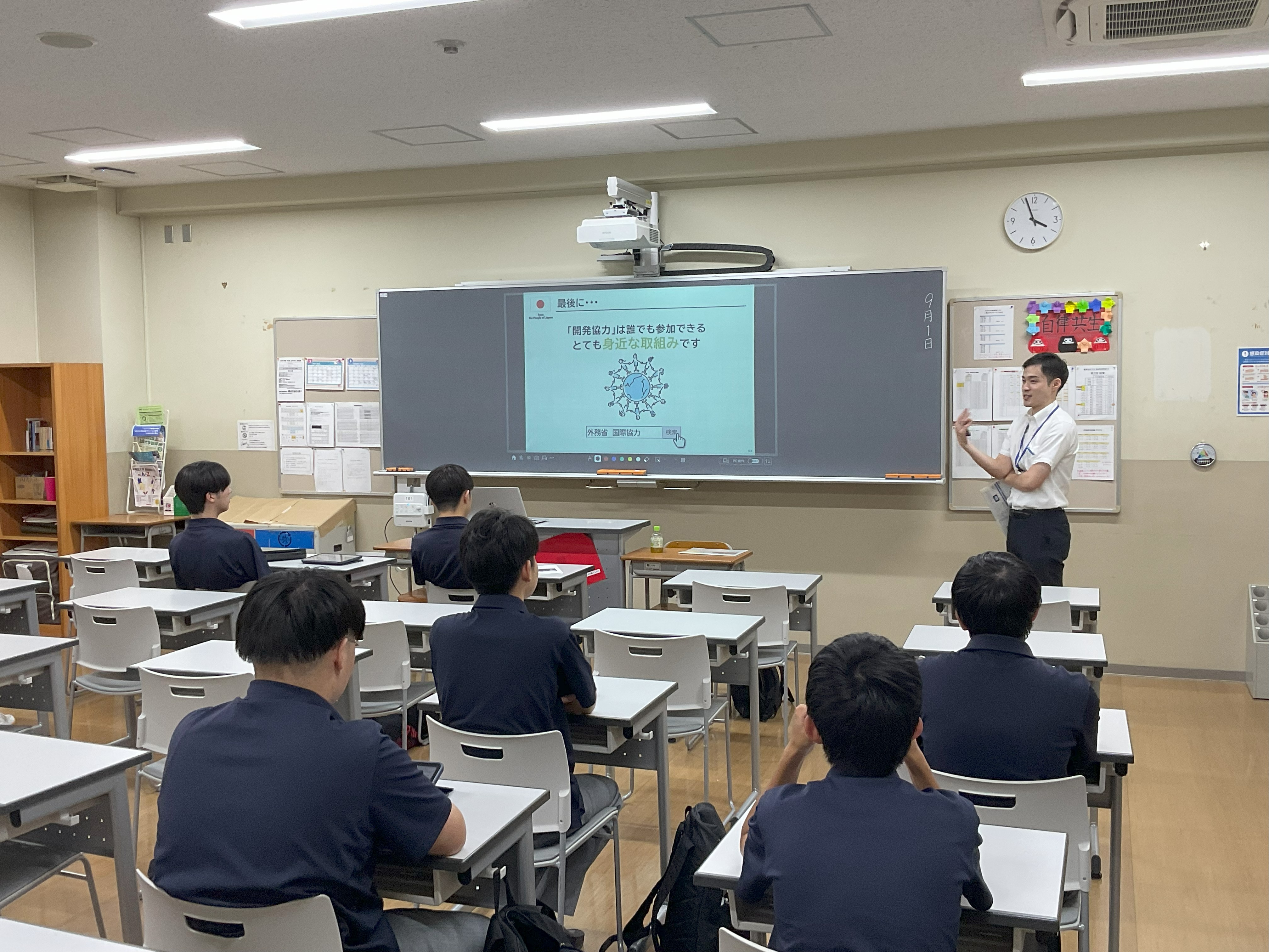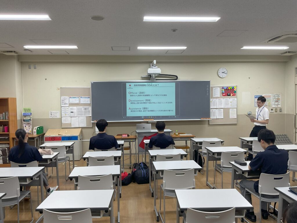 8月26日(木)の午後に外務省の方を講師としてお招きし、本校にて出張授業(外務省ODA出前講座)を実施していただきました。当日は海外や経済、国際協力などに興味を持つ1・2年生18名が参加しました。参加した生徒はJICA地球ひろば訪問などを通じて学んだ日本人と現地の人々の個での結びつきによる国際貢献という考え方とは少し違う、ODAを通じて日本という国が発展途上国のために行うことができる国際貢献について学びました。