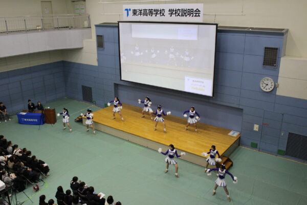 前回と同様に、「生徒の顔が見える説明会」というテーマで、部活動を代表してソングリーダー部による演舞をご覧いただき、その後、生徒会生徒による部活動紹介、学校行事の紹介、制服紹介をいたしました。
