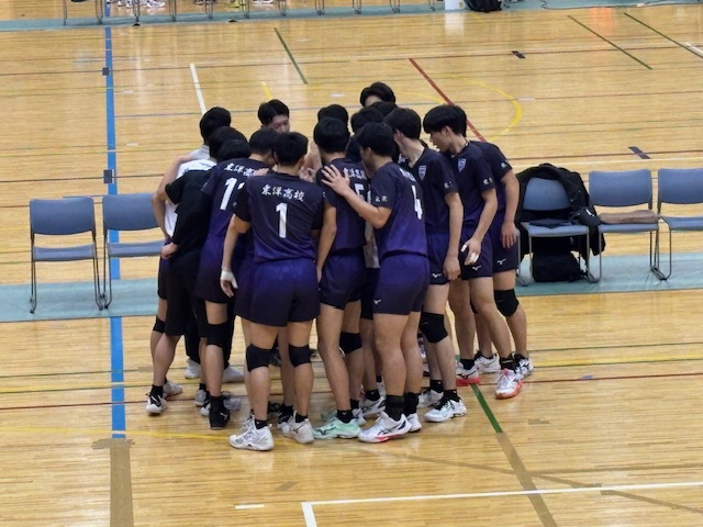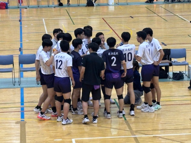東京第一代表を賭けた決勝戦の相手は、前年度の春高バレーで優勝をしている駿台学園です。駿台学園も準決勝の相手をストレートで破り、貫禄の決勝進出を決めていました。午後5時少し前に始められた試合の序盤は、東洋がなかなか波に乗れず相手のリードが続く展開が続きました。連続ポイントを取りたいところでのサーブミスなどもあり、じりじりと相手にリードされ、21対25で第一セットを取られてしまいました。第一セットを先取されてしまった後の様子を見ていると、選手たちが集まって話し合っている様子が窺えました。自分たちで考え、うまくいかなかった動きを確認し修正するというシーンのように見え、選手たちが頼もしく思えました。