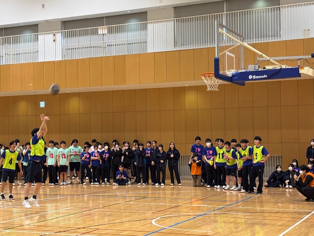 午前中、女子のドッジボールと同一コートで交互に行われた男子のバスケットボールでは、バスケットボール経験者が多くいるチームが圧倒的に有利に見えました。華麗なドリブルを見せたり、スリーポイントシュートを入れたりするなど、見応えのある試合が繰り広げられ、各試合の応援にも熱が入っていました。どの試合でも、クラスで一体感のある応援がコートの縁を彩り、その応援を見ているだけで嬉しくなるような光景でした。