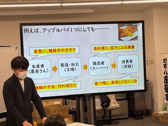 ガモール堂での実践が地域課題やフードロス問題の解決に留まらず、アントレプレナーシップ教育にも役立っているというような高柳先生のお話の後、地域創生学部3年生の戸澤さんにバトンタッチされ、現在は通常授業の合間(とても大変らしいです!)に2年生17名で運営されているというガモール堂の取り組みと運営に関する話がありました。新商品の開発や試作を行う「食品開発班」、Instagramの運営やメニュー表、ポスター制作などの広報活動を行う「宣伝班」、季節ごとのイベント企画や店舗のスペース利活用などを担う「イベント企画班」などに分かれ、活動を展開しているということでしたが、フードロスの削減やPR活動を通したマーケティング、近隣地域との連携など、班ごとに様々なことを考えながら運営する難しさを、具体例を交えながら説明してくださいました。