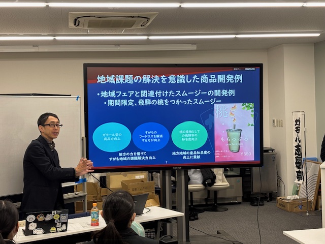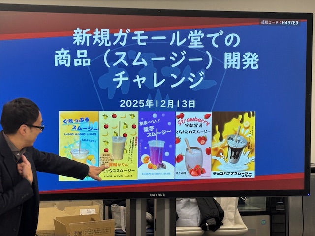 食材の生産者、製造・加工工場、販売者、消費者と、様々な場所・場面でフードロスが起こることを踏まえ、そのフードロス削減に貢献するメニューとしてガモール堂で考案・販売されるようになったのがスムージーだったということで、今回東洋生が取り組むのは3・4月頃に発売されるというスムージーメニューの開発でした。